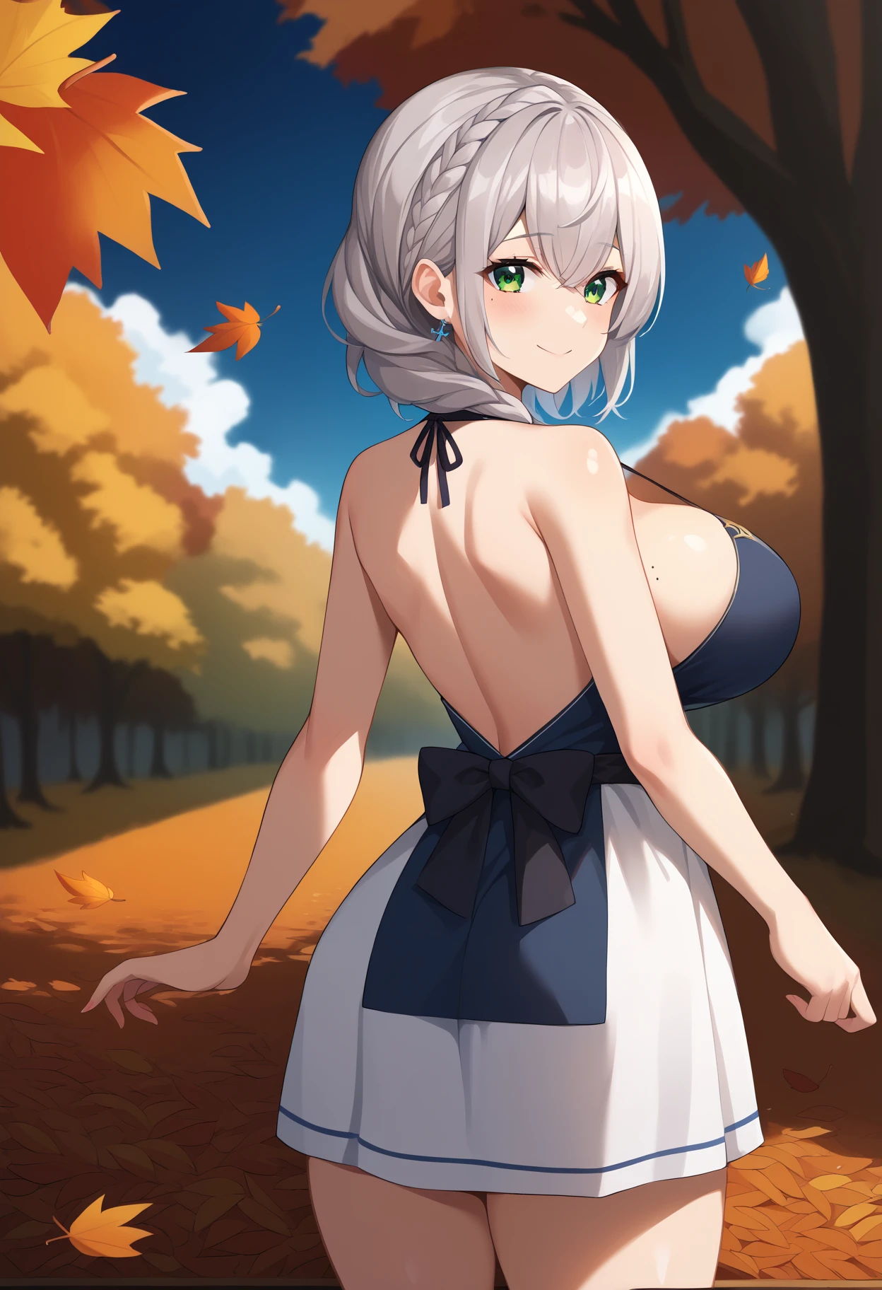 >shirogane noel, shirogane noel \(school uniform\), hololive, 1girl, breasts, short hair, bangs, skirt, large breasts, shirt, hair ornament, bow, school uniform, green eyes, white shirt, braid, grey hair, pleated skirt, collared shirt, bowtie, plaid, blue bow, plaid skirt, x hair ornament, blue bowtie