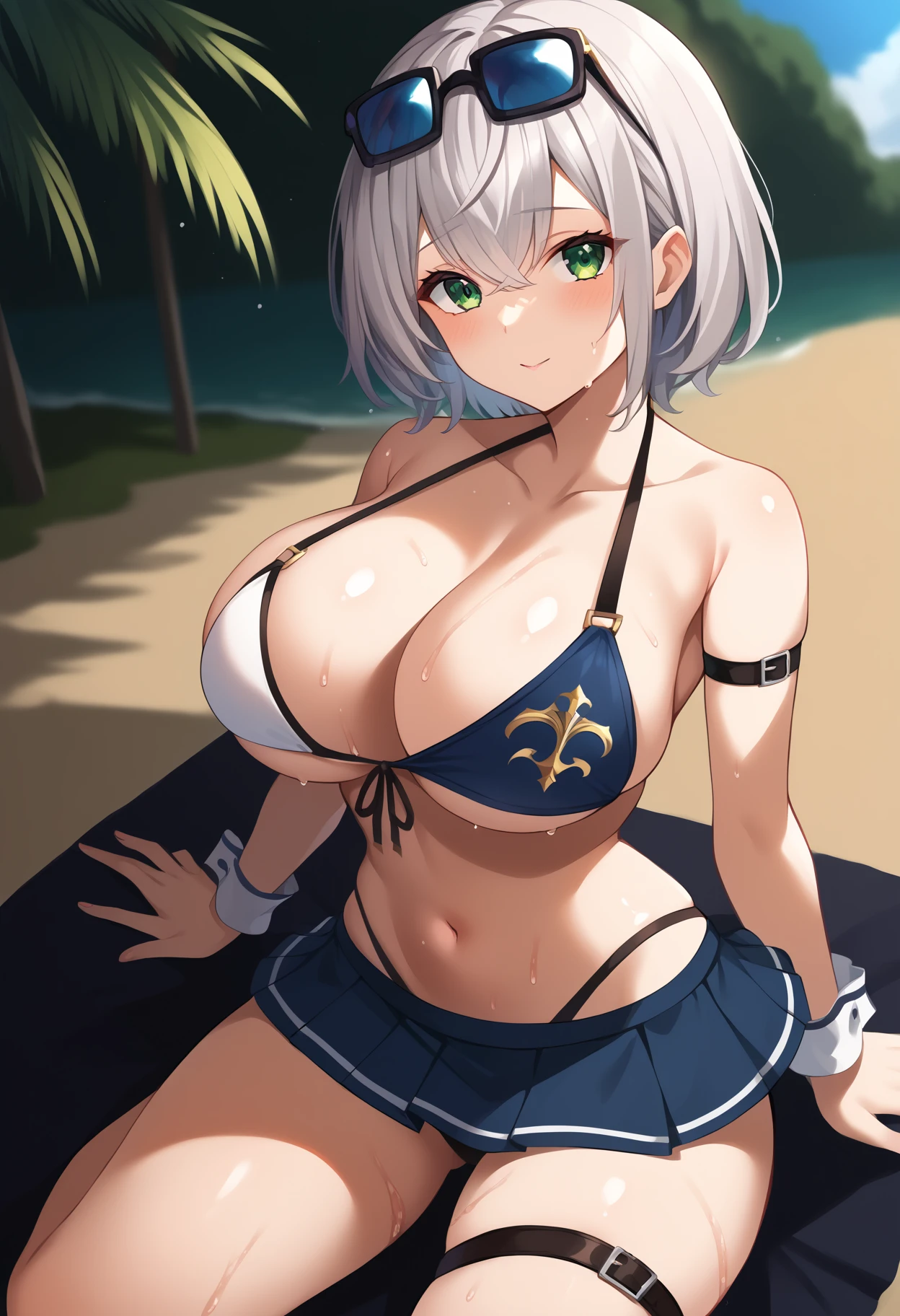>shirogane noel, shirogane noel \(summer 2020\), hololive, 1girl, breasts, short hair, bangs, skirt, large breasts, navel, cleavage, hair between eyes, bare shoulders, green eyes, collarbone, swimsuit, grey hair, bikini, stomach, blue skirt, wet, wrist cuffs, thigh strap, wavy hair, sunglasses, front-tie top, eyewear on head, front-tie bikini top, arm strap, two-tone bikini, chest belt