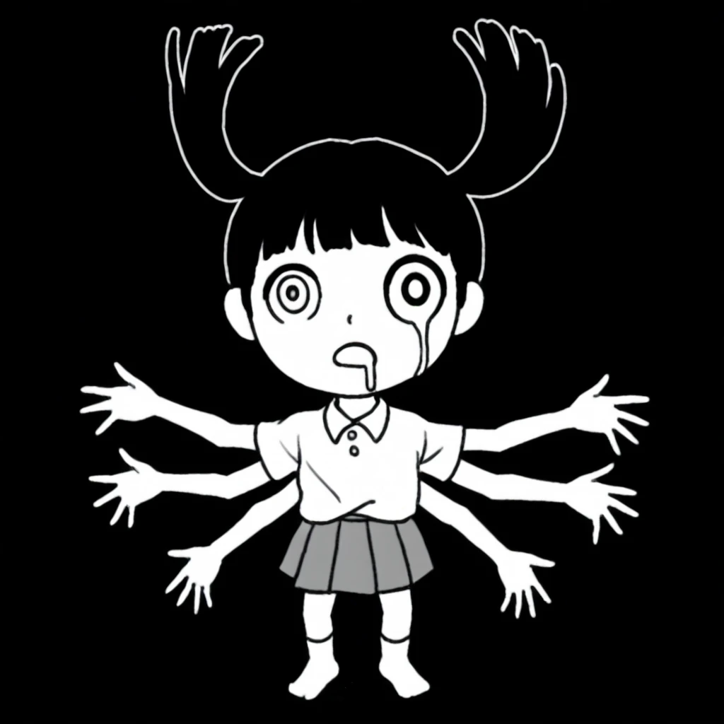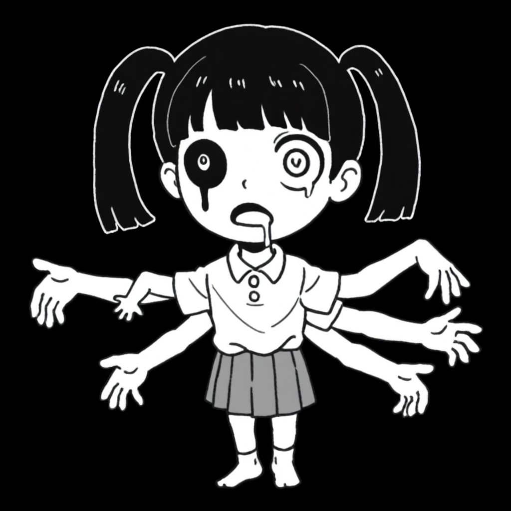 MonokoYN, 1girl, pale white skin, black hair, twintails, dripping_eye, drooling, extra_arms, mismatched_pupils
