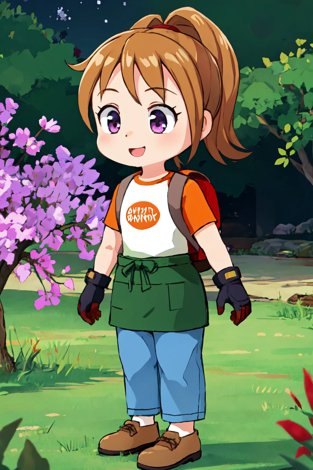 pony1, brown hair, shirt, gloves, purple eyes, ponytail, short sleeves, brown shoes, pants, backpack, green apron, high ponytail, denim, jeans, blue pants, raglan sleeve