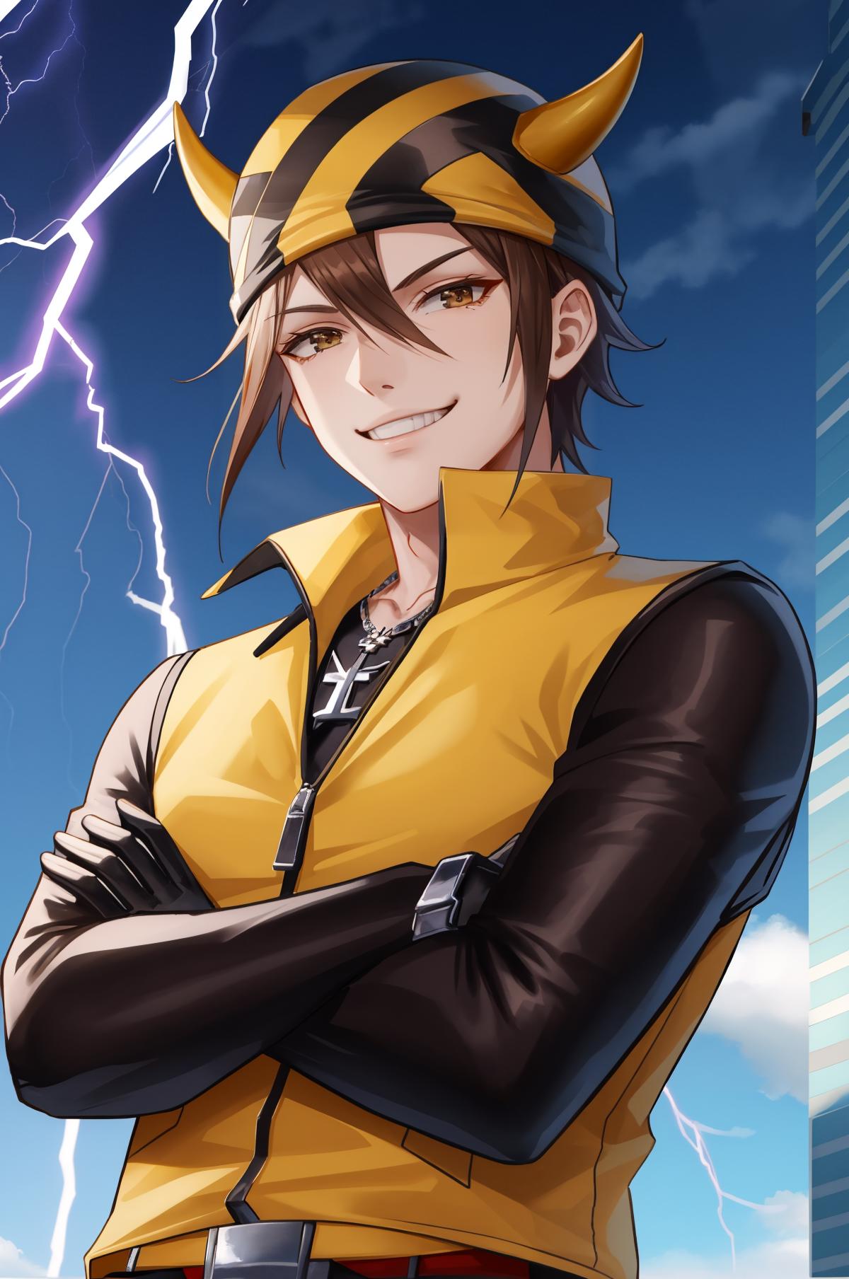 Tags: yuichish, brown hair, hat, vest, gloves, short hair, fake horns, black pants, necklace, boots