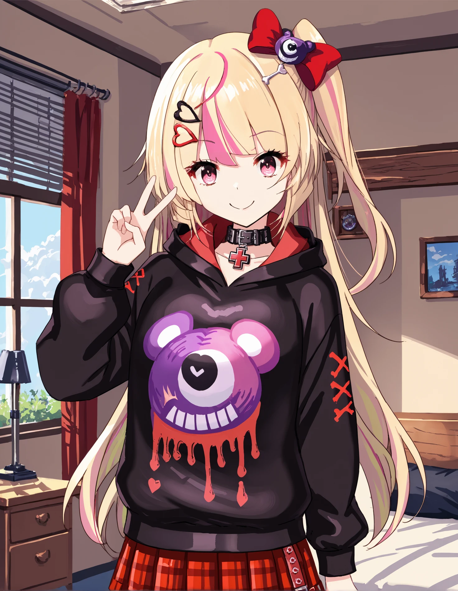 Public outfit: mgrcashleytaylor, ashpbc, red hair bow, white hairpin, red hairclips, black collar, red cross pendant, black hoodie with print, red pleated skirt with belt, grey striped thighhighs