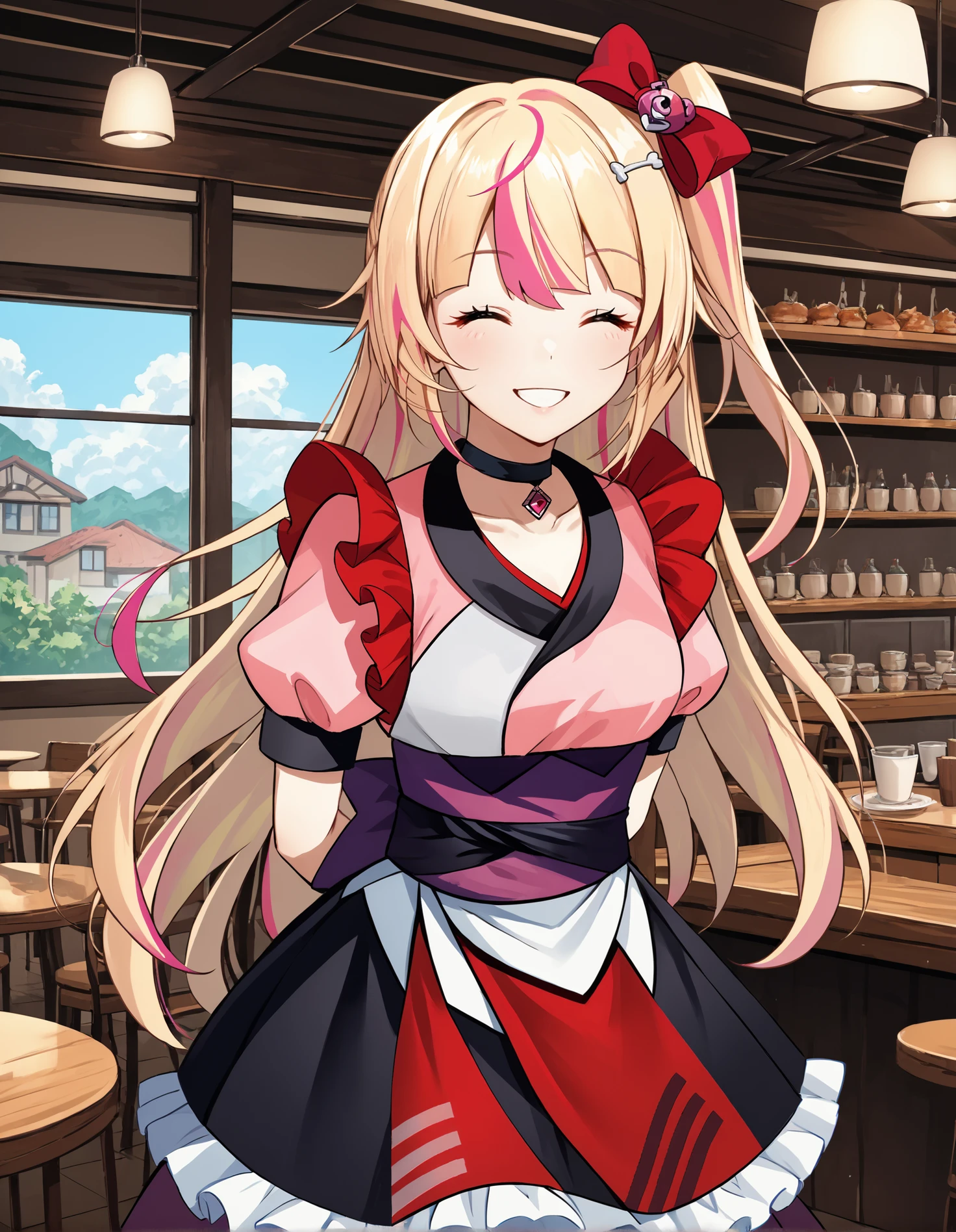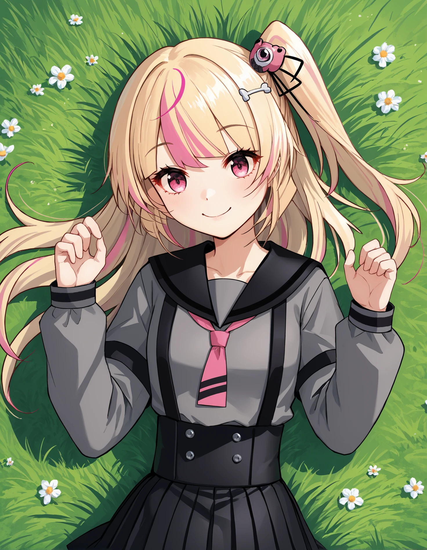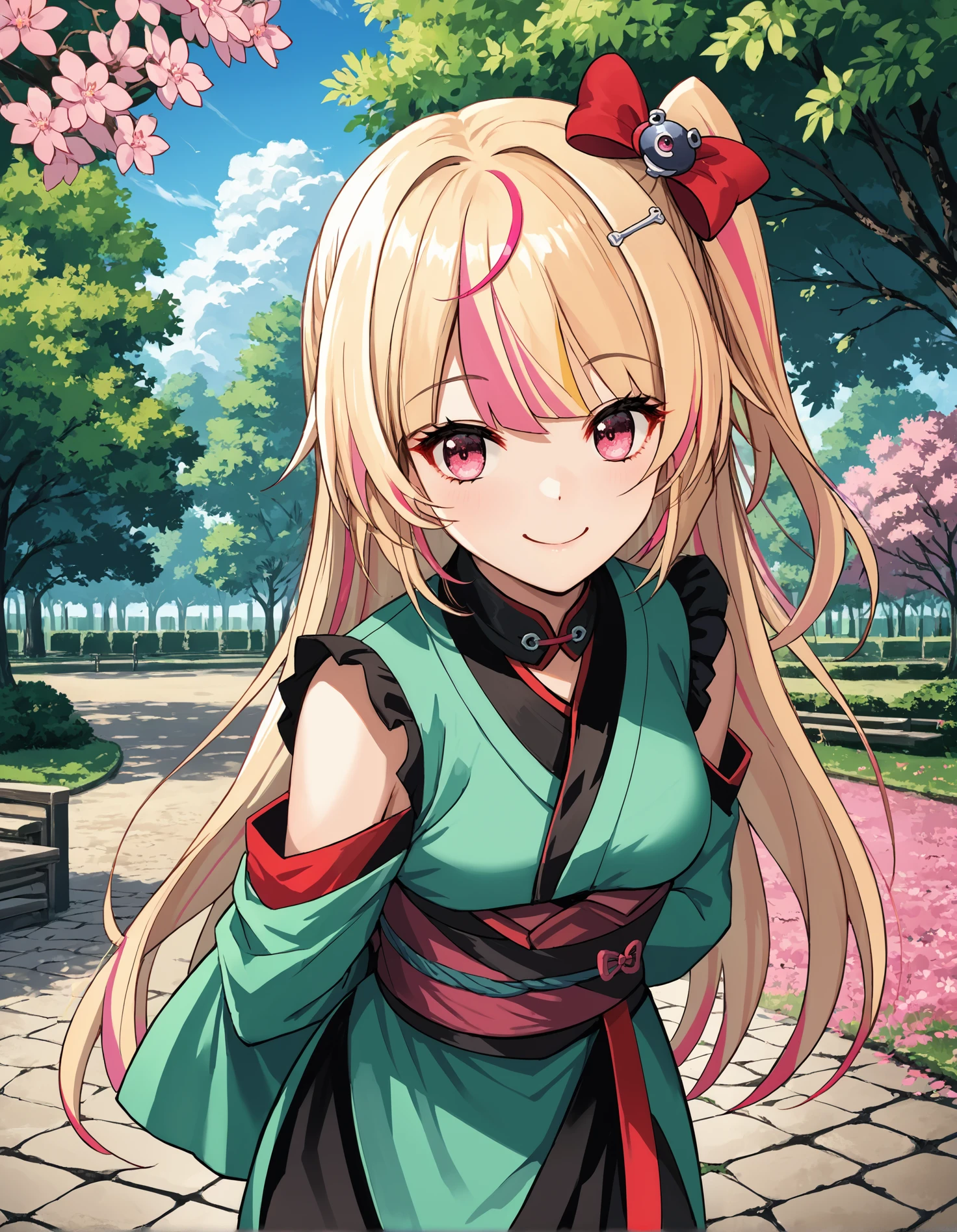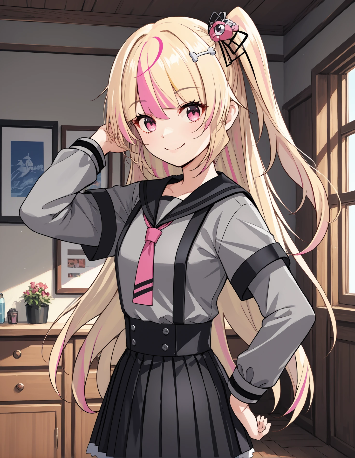 Appearance: blonde streaked hair, long hair, side ponytail, pink eyes