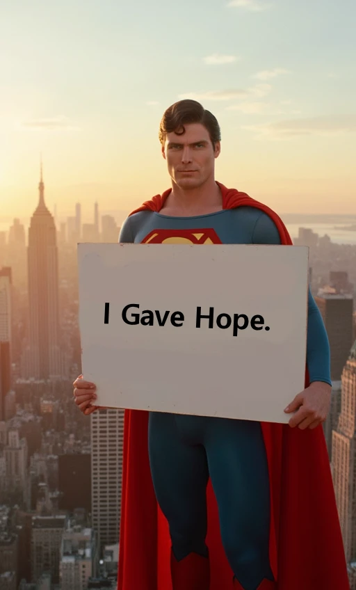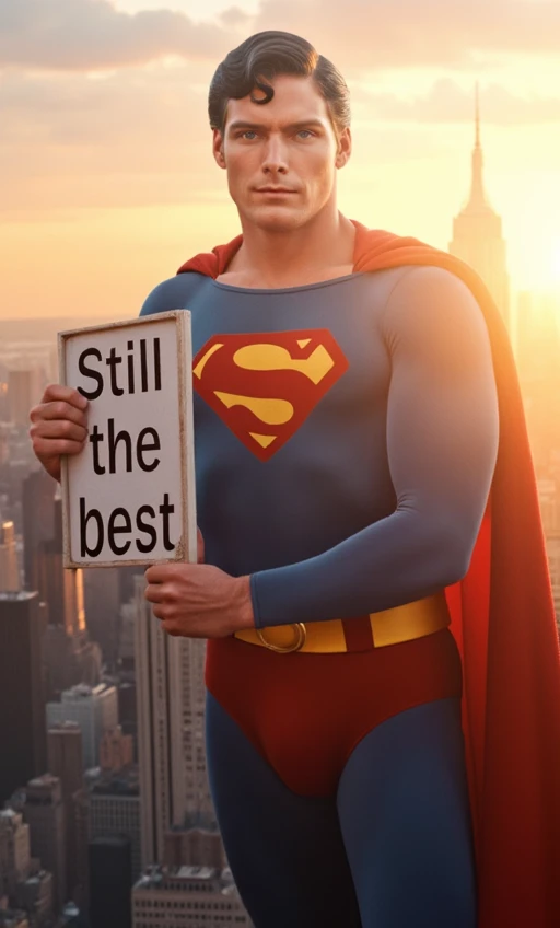 Depicts Superman from the late 70s and 80s style with Reeve as the character.