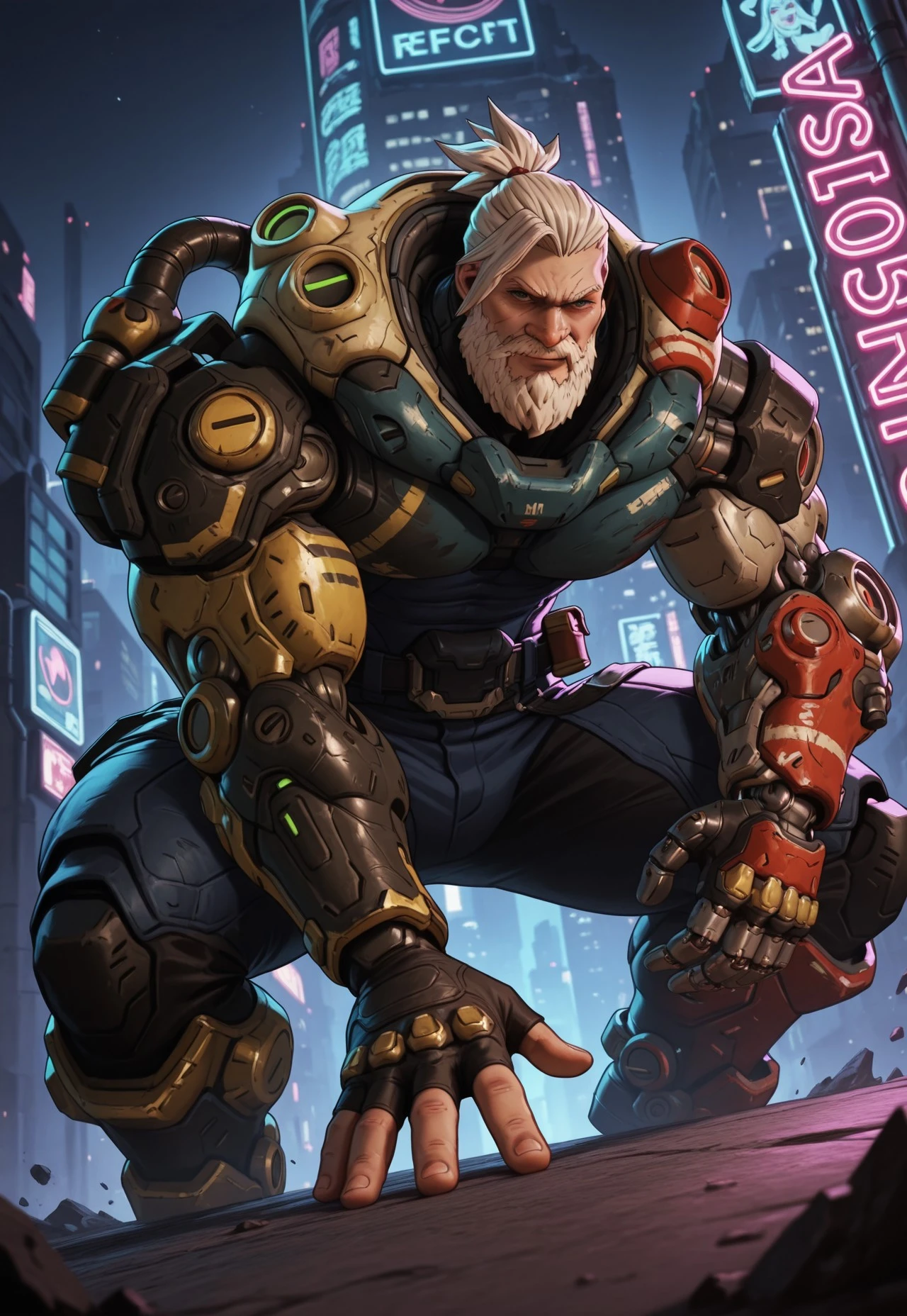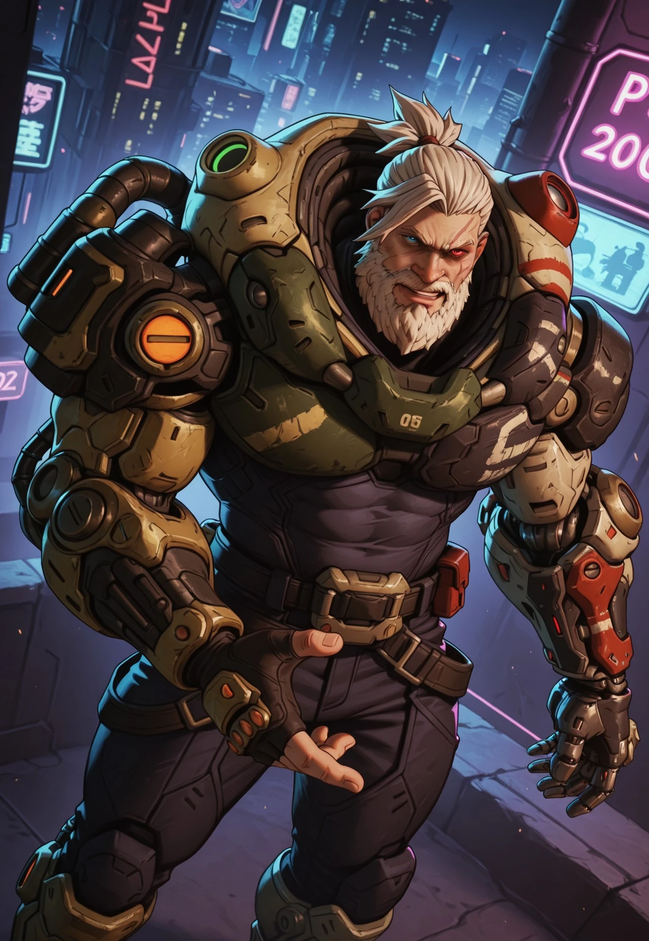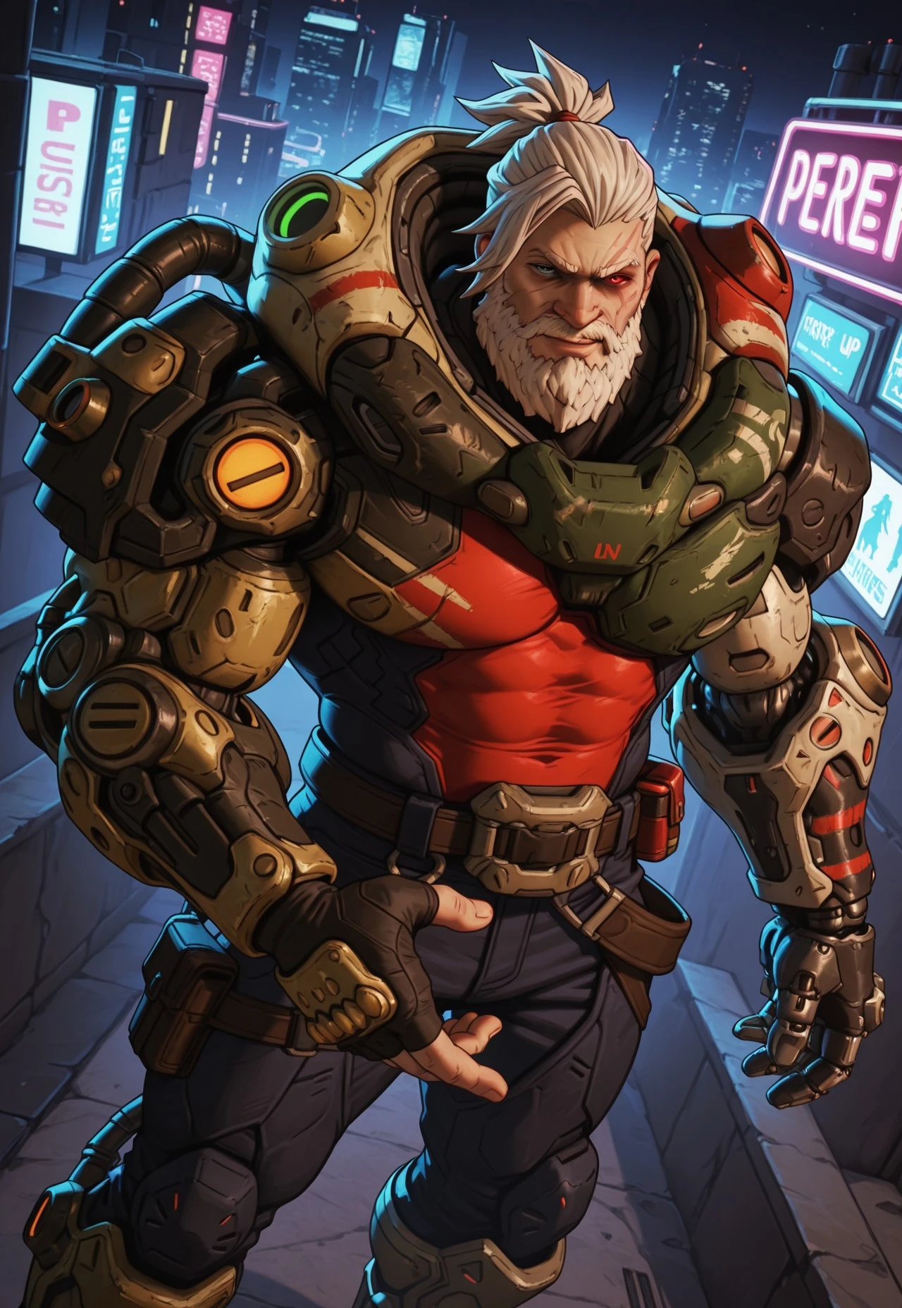 power armor,left mechanical arm,left mechanical hand,belt,right fingerless gloves