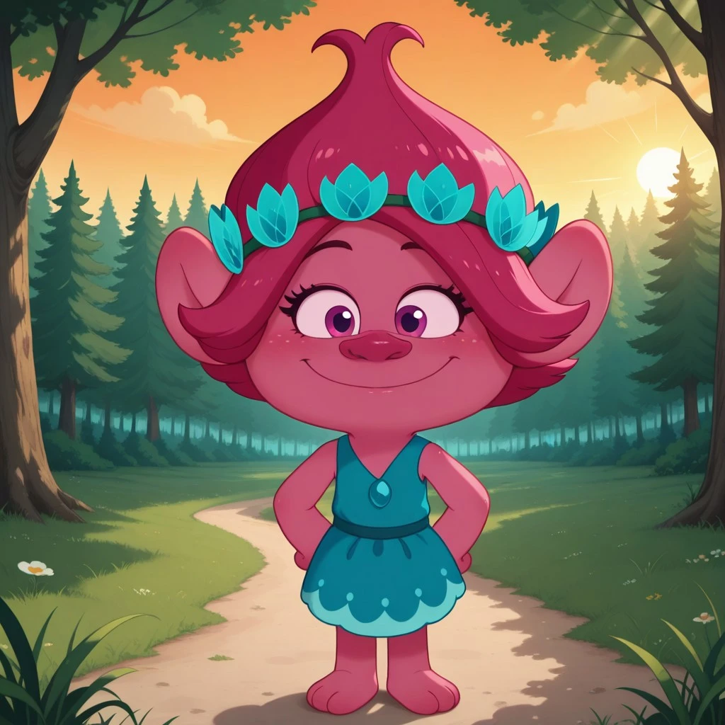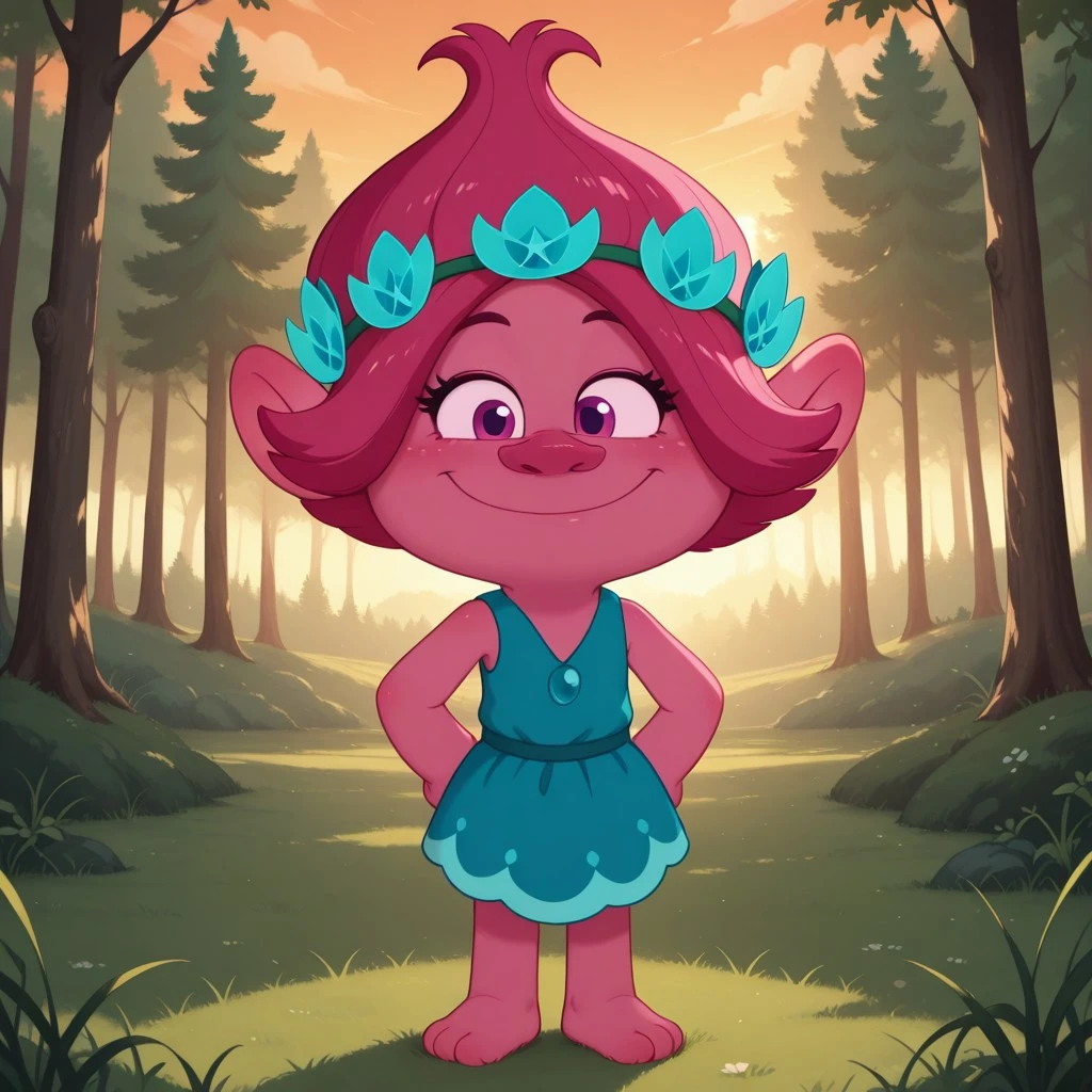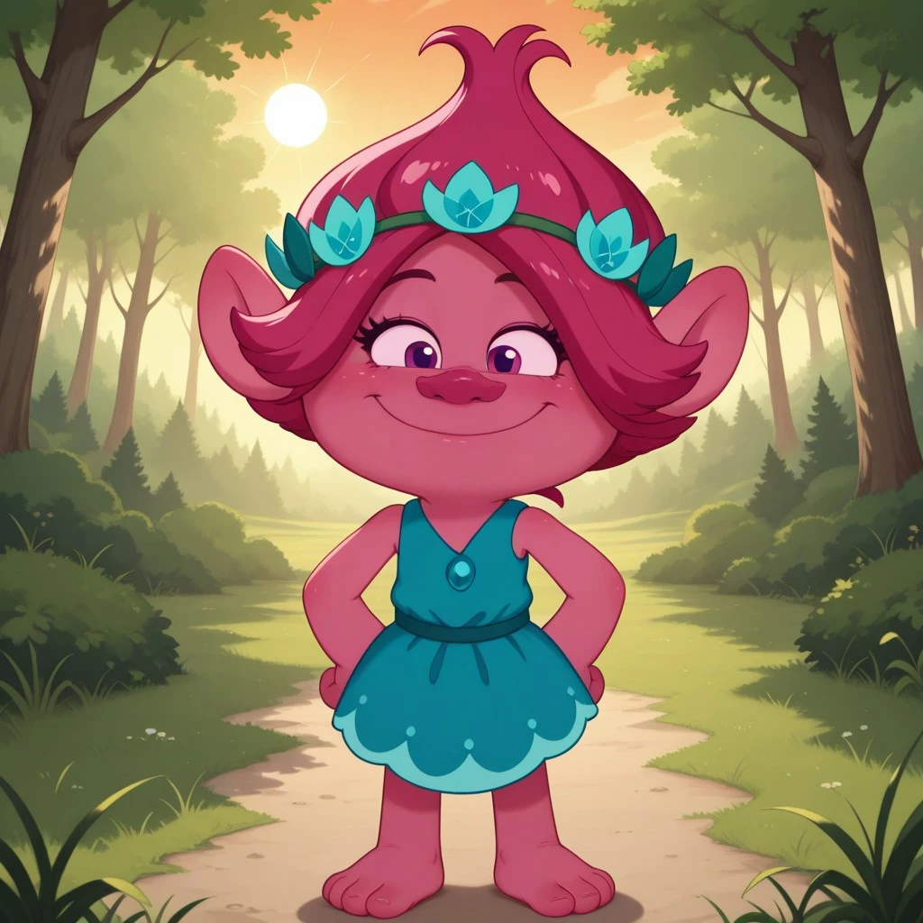 Poppy_(Trolls), 1girl, solo, pink hair, head wreath, pink skin, pink skin female, teal and light blue dress, barefoot