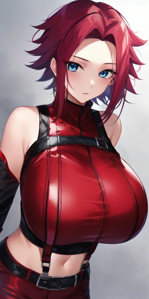 brown_chest_harness_detached_sleeves_red_crop_top_brown_short_shorts: her OG outfits with a chest harness and a red tanktop.