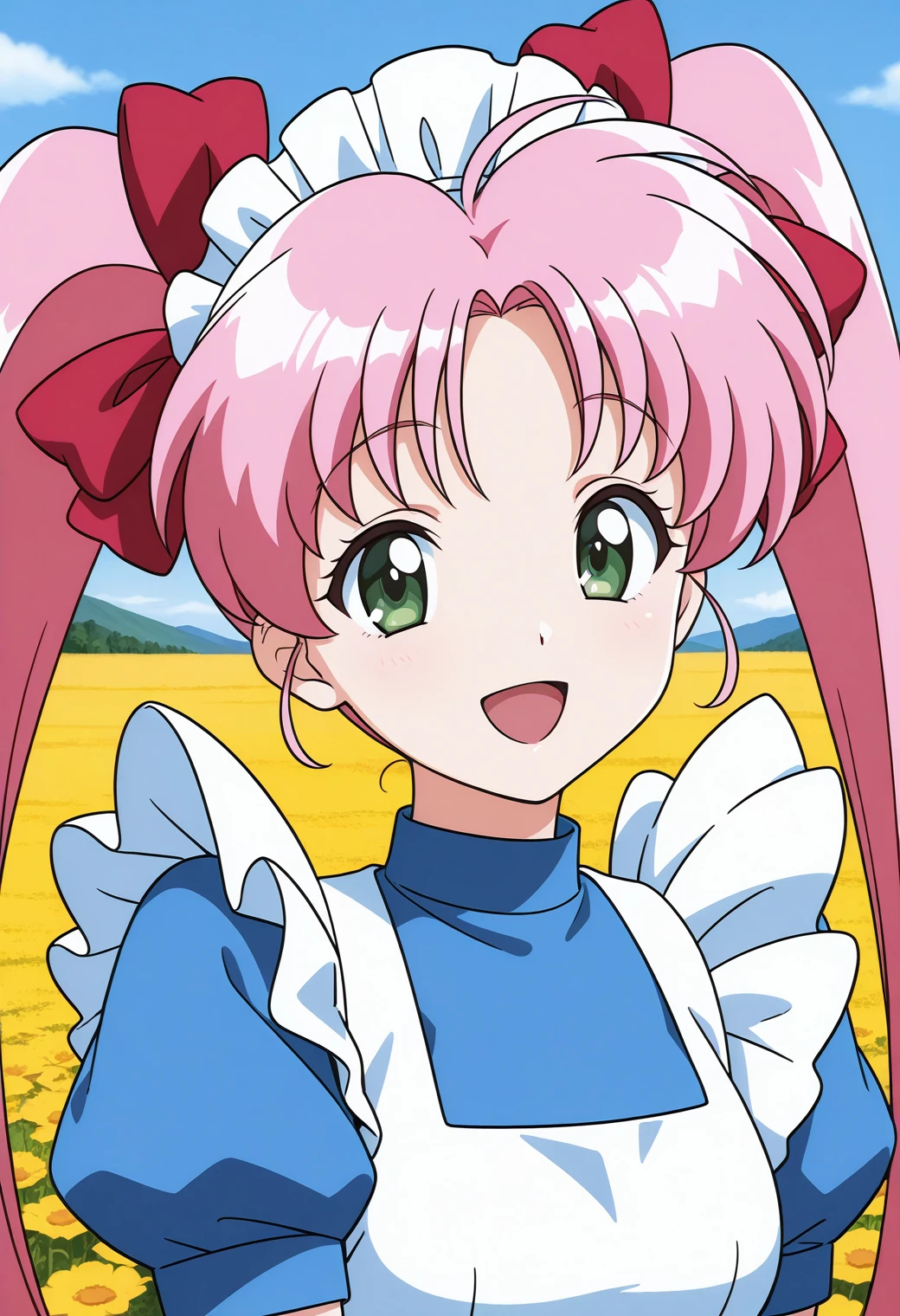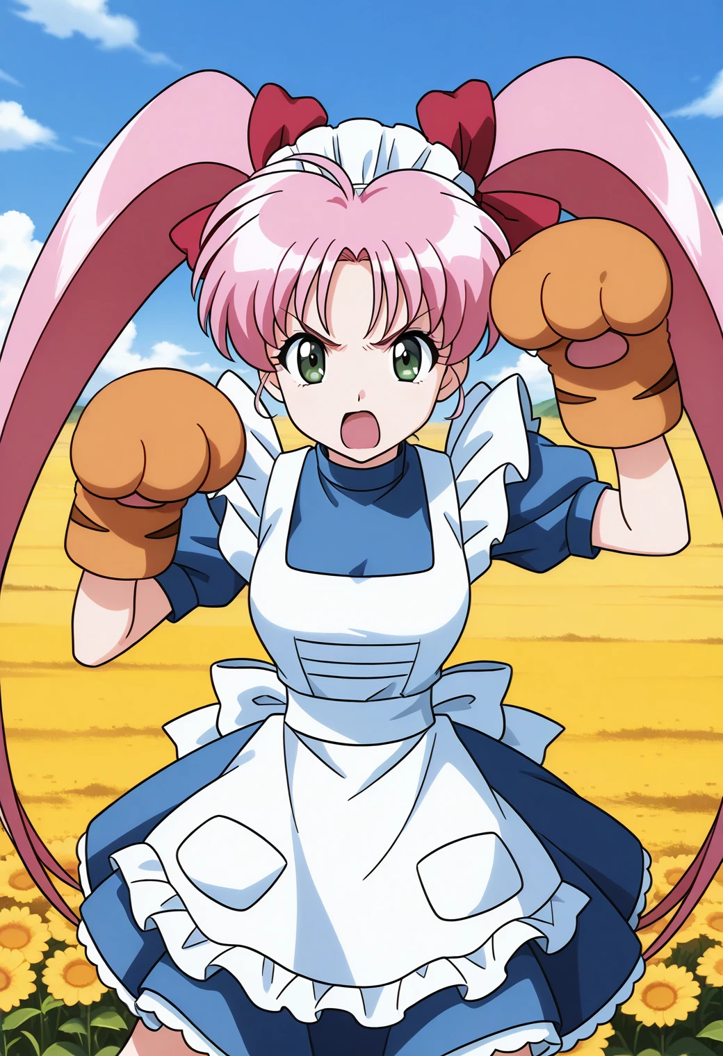 vg_manami, green eyes, pink hair, long hair, twintails, hair ribbon, maid headdress, animal hands, paw gloves, white apron, blue maid, short sleeves, blue skirt,