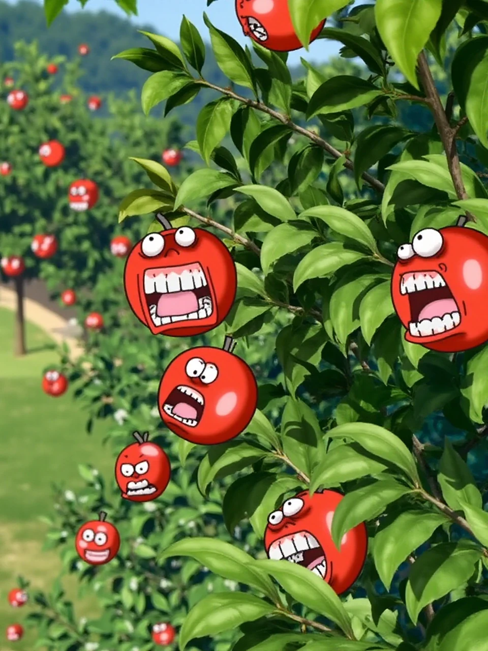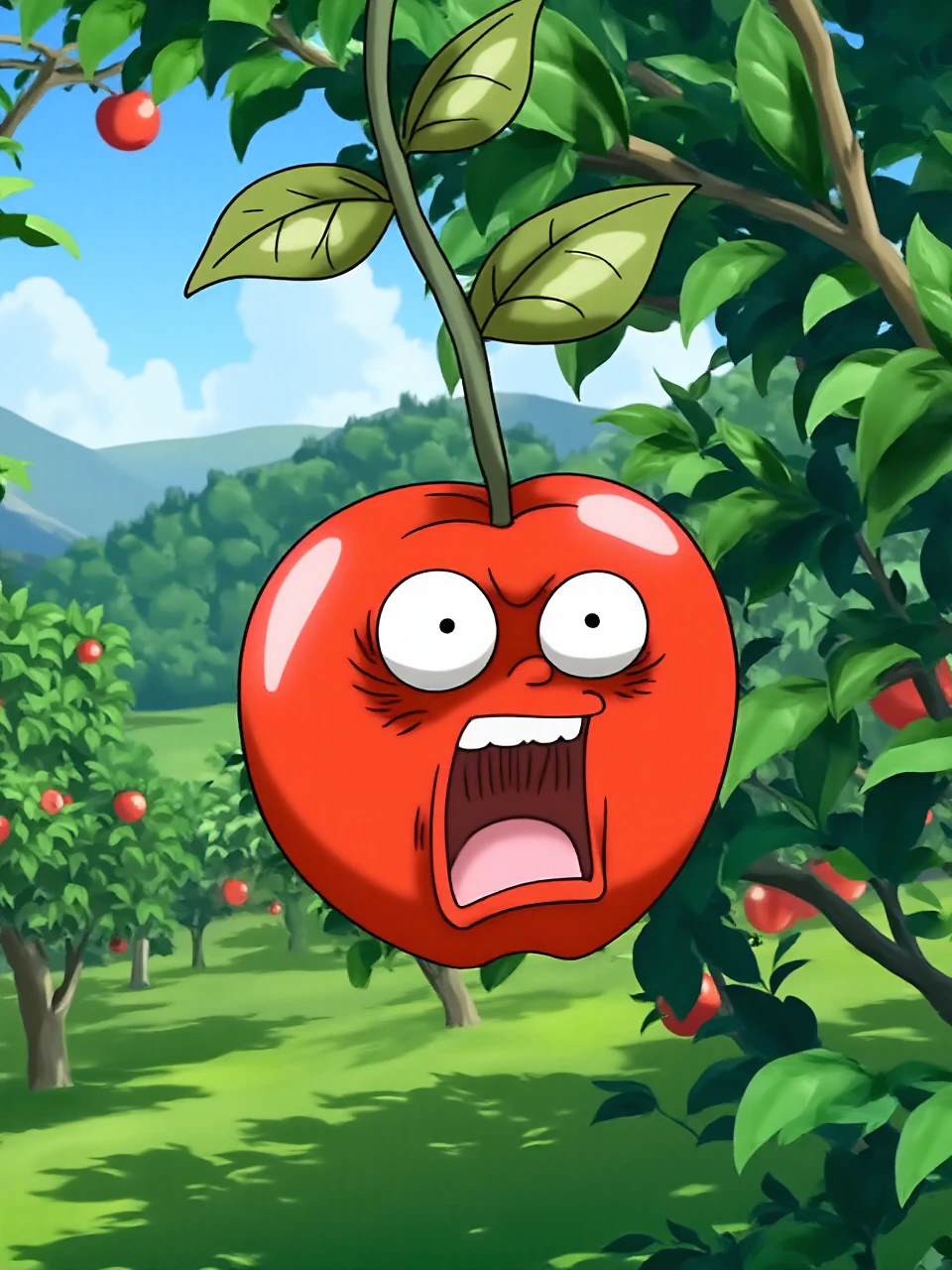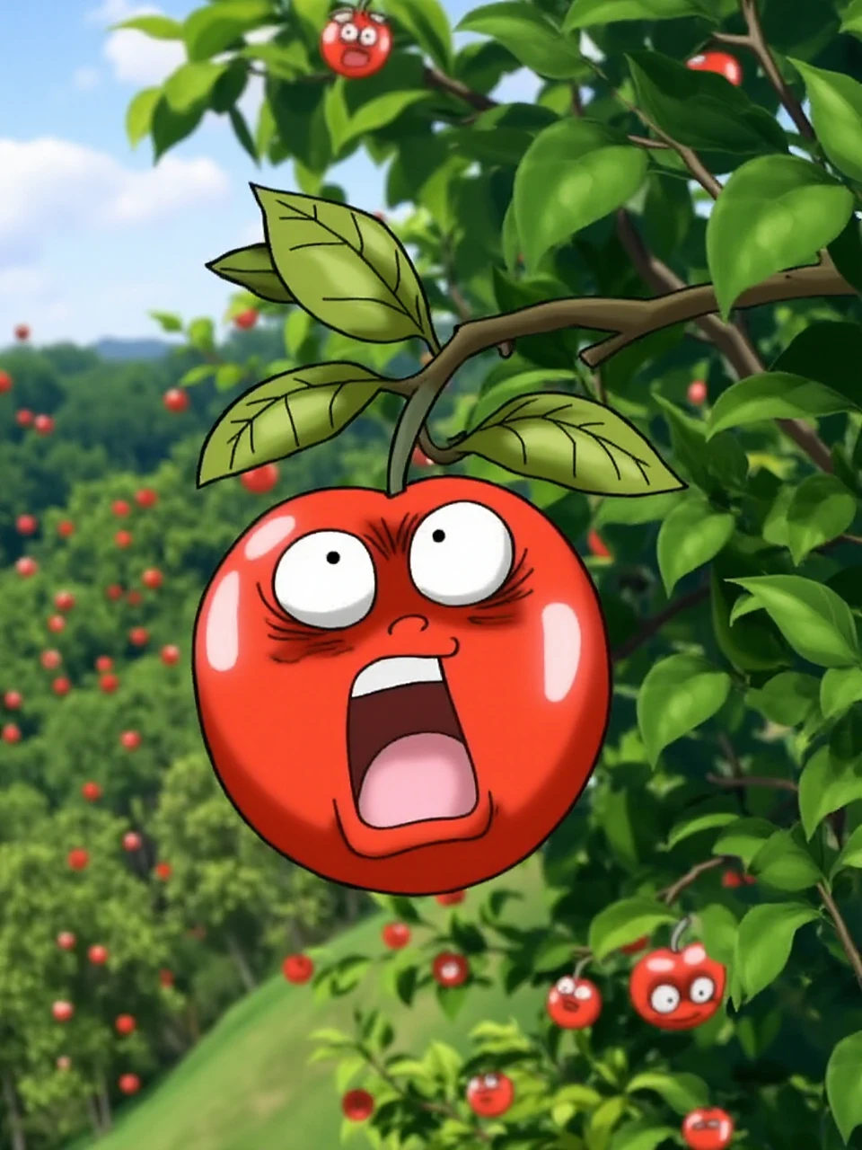 (surprise apple), best quality, high quality, highres, masterpiece,outdoors, tree,leaf, smile.
