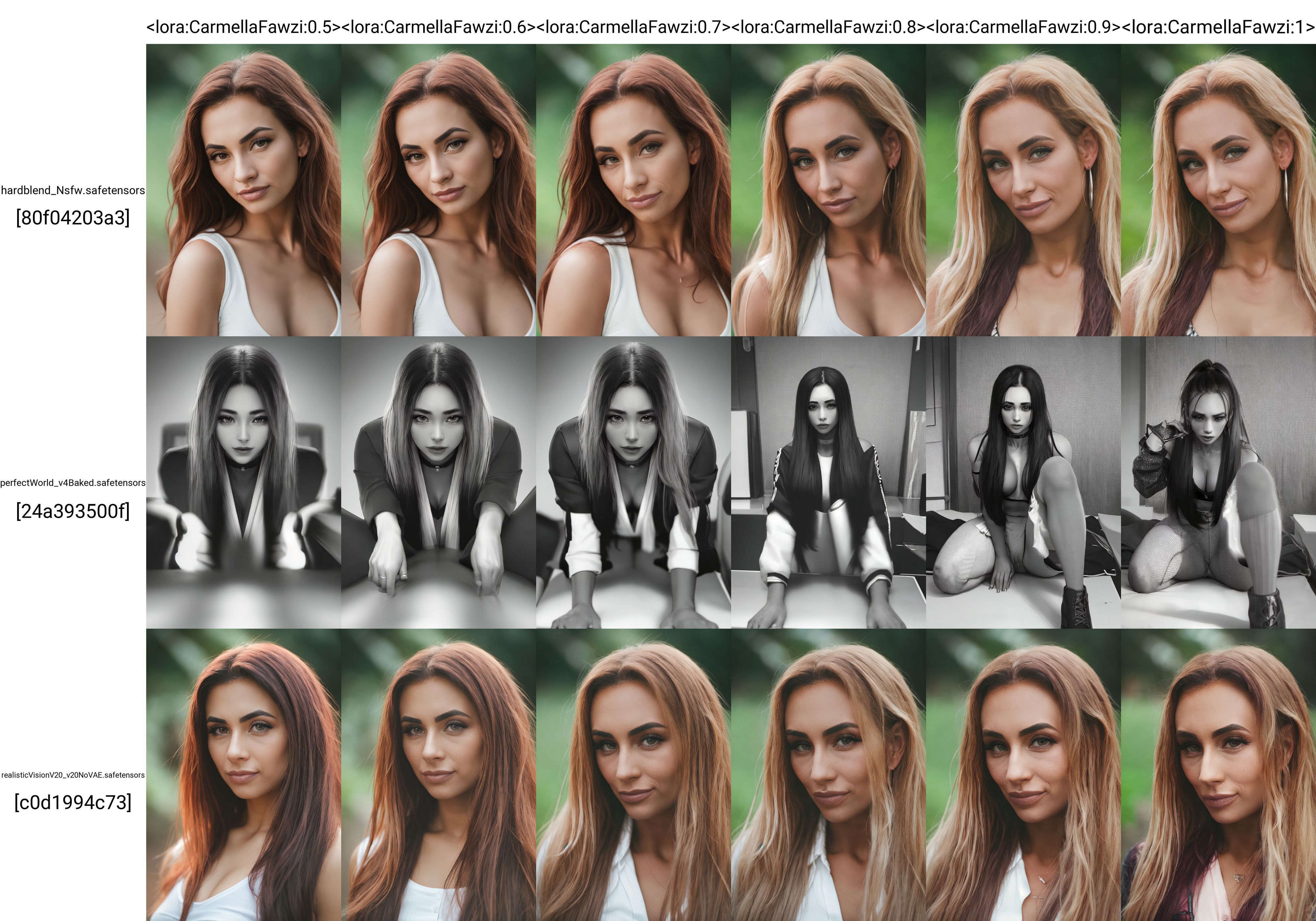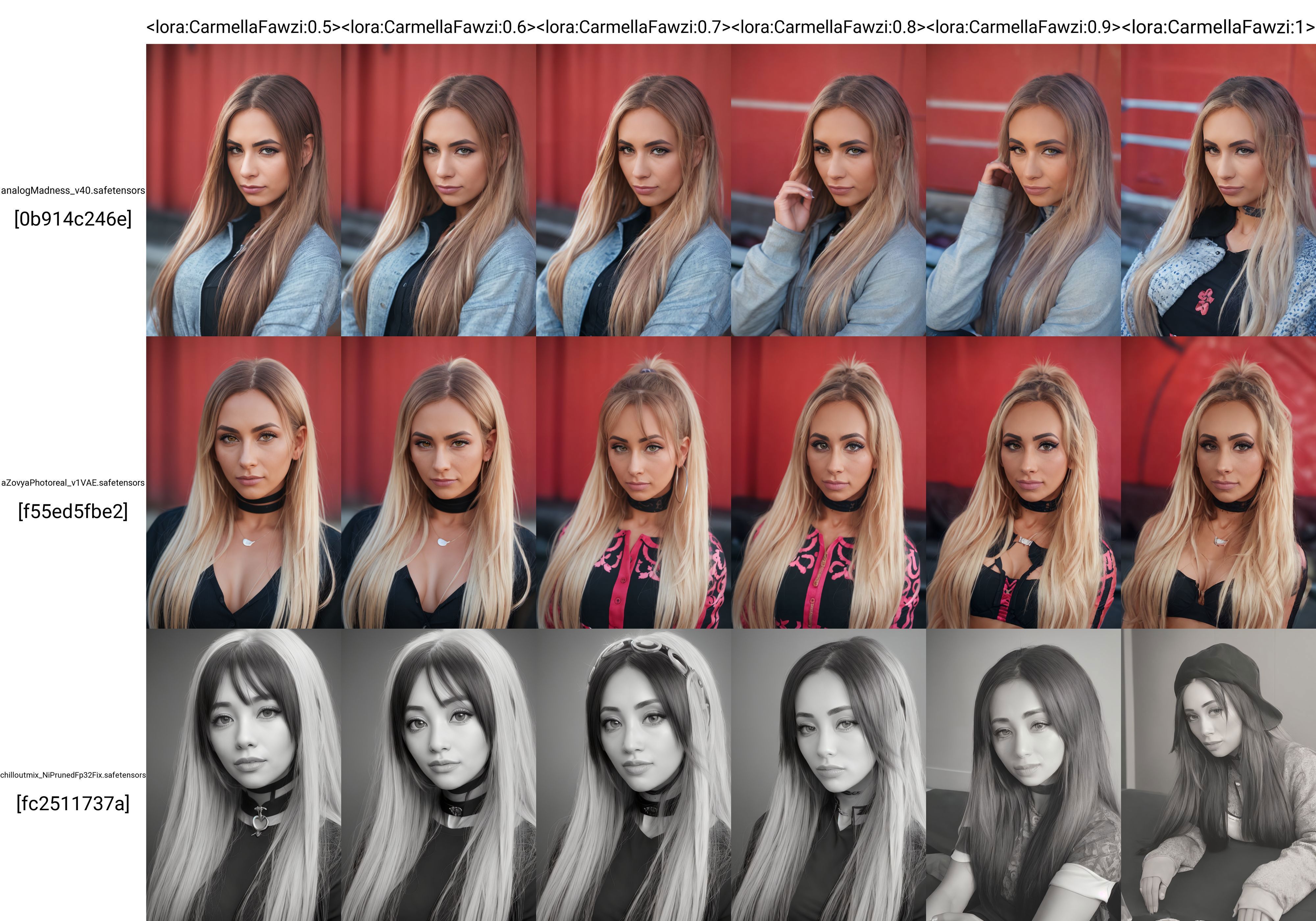 Carmella LoRA Trained on SD 1.5, please find examples and a comparison between Checkpoints & Strengths in the model showcase.