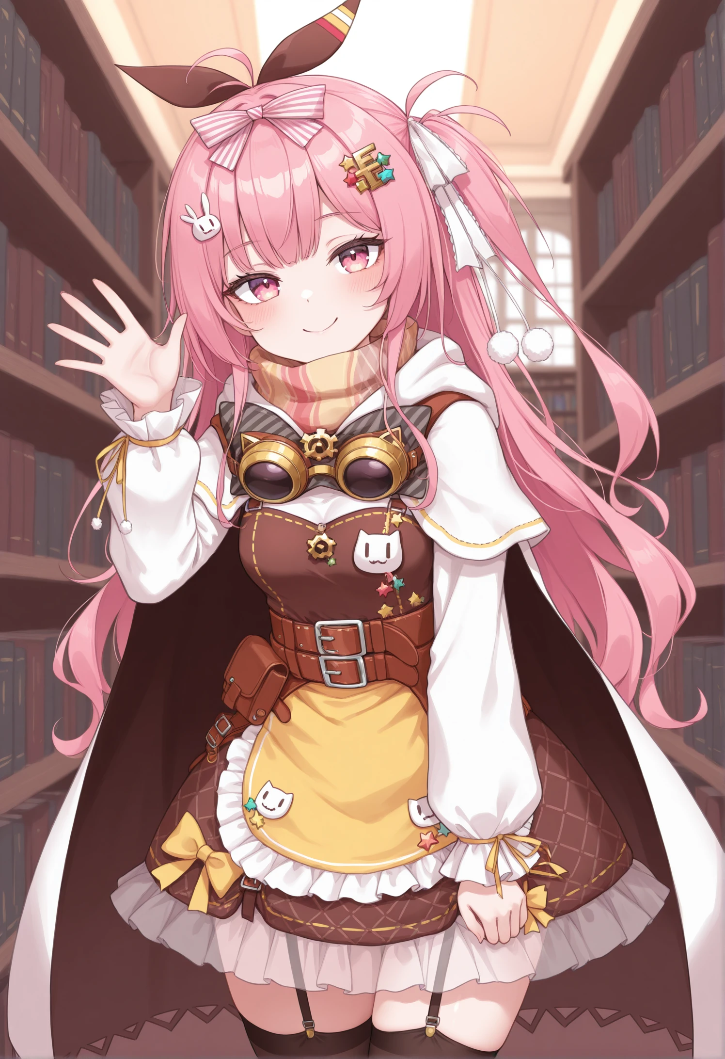 rabbit hair ornament,hair ornament,hair ribbon,hair bow,star (symbol),cape,scarf,dress,goggles,long sleeves,striped,belt,black thighhighs,garter straps,