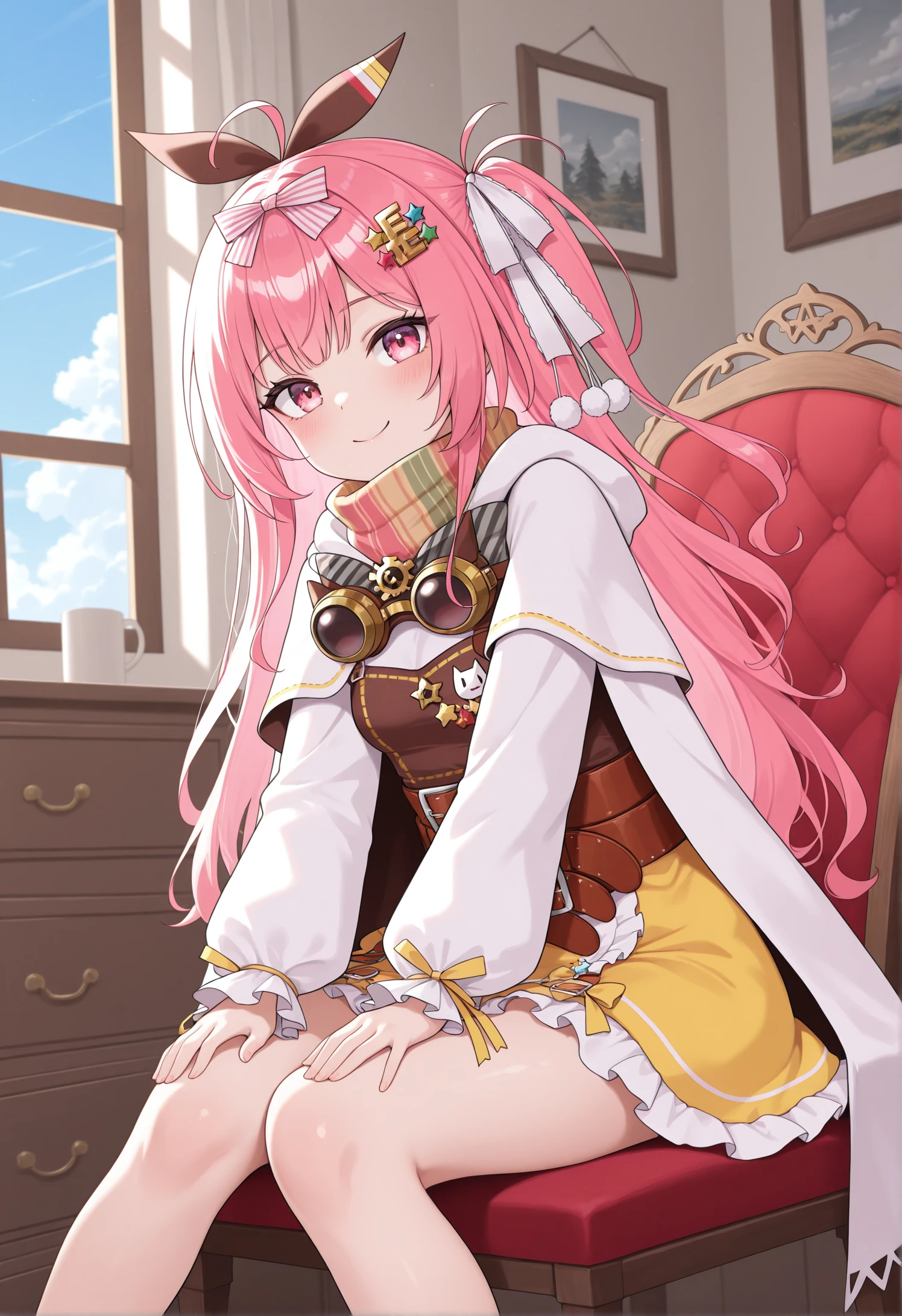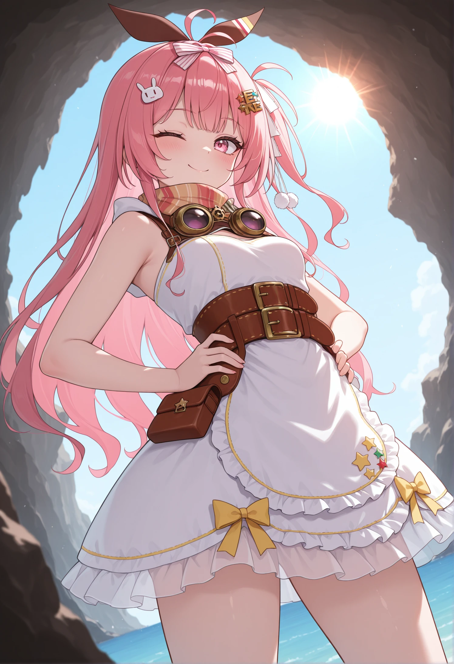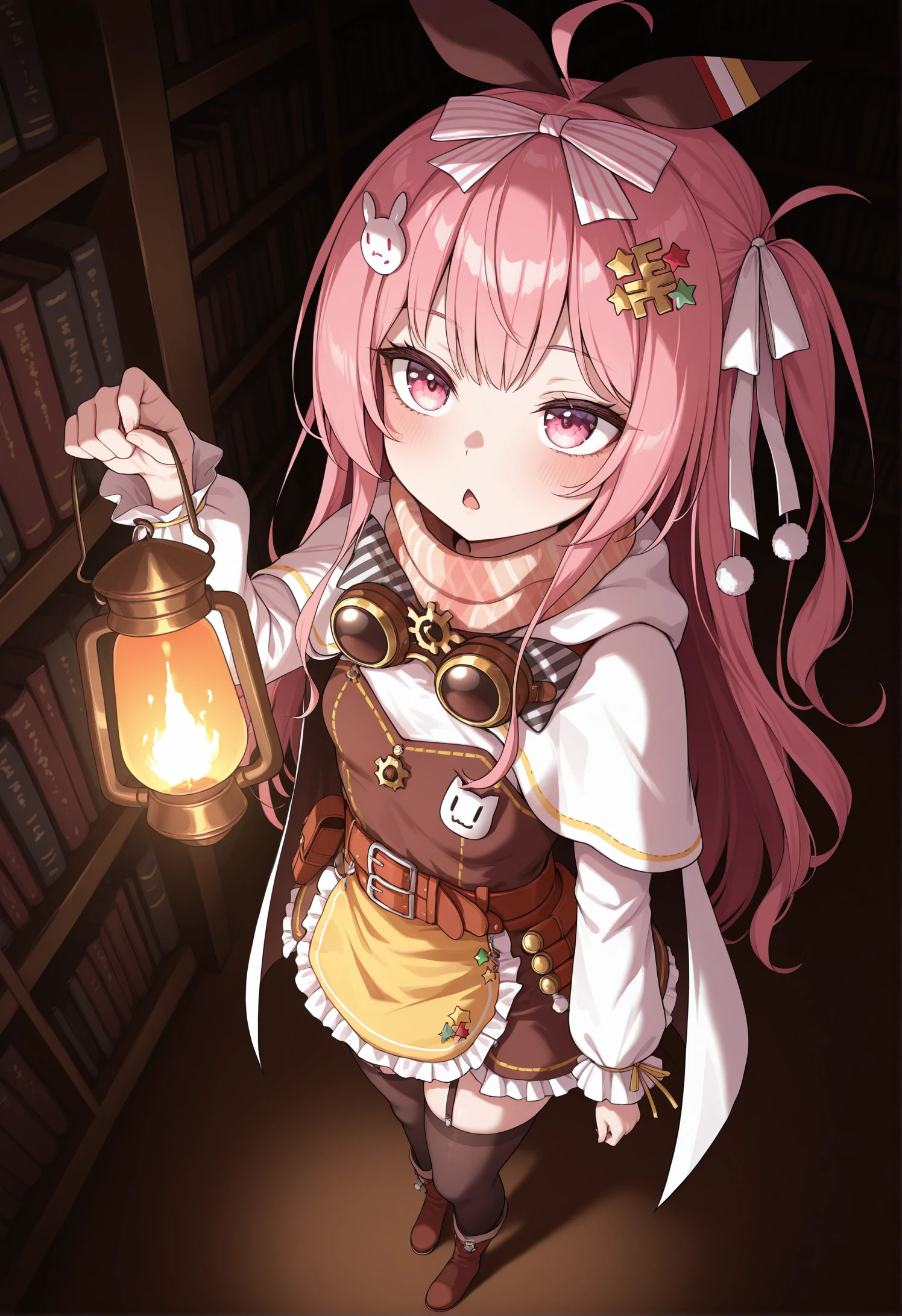 pink eyes,pink hair,one side up,long hair,ahoge,