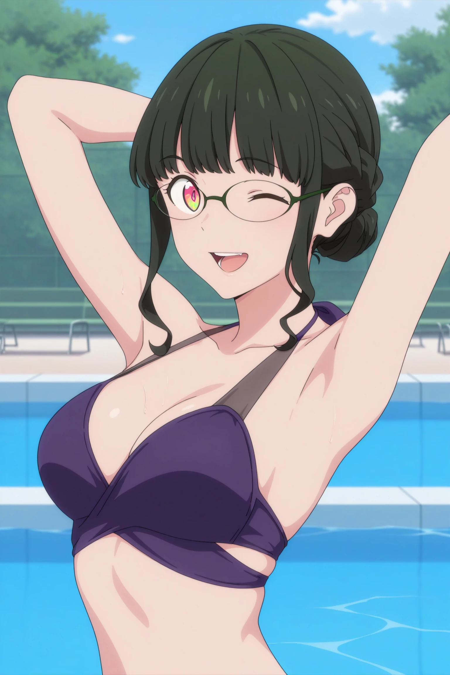 anosillus the 2nd, dark green hair, short hair, half up braid, single hair bun, blunt bangs, sidelocks, multicolored eyes, glasses, heart earrings, grey jacket, musical note ornament, treble clef, white shirt, collared shirt, lanyard, open jacket, belt, grey pants, white footwear, flatsNOTE