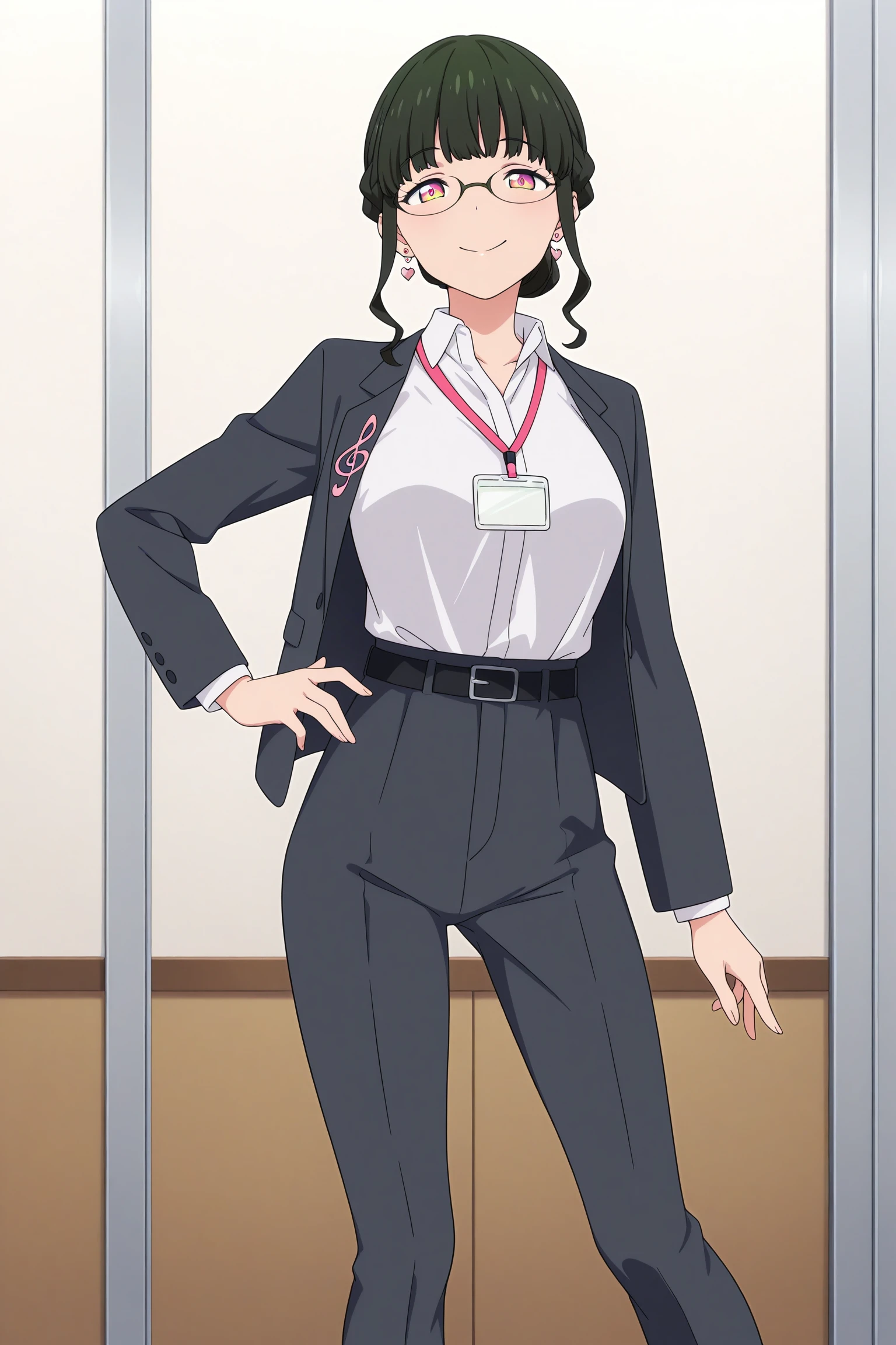 anosillus the 2nd, dark green hair, short hair, half up braid, single hair bun, blunt bangs, sidelocks, multicolored eyes, glasses, heart earrings, grey jacket, musical note ornament, treble clef, white shirt, collared shirt, lanyard, open jacket, belt, grey pants, white footwear, flats