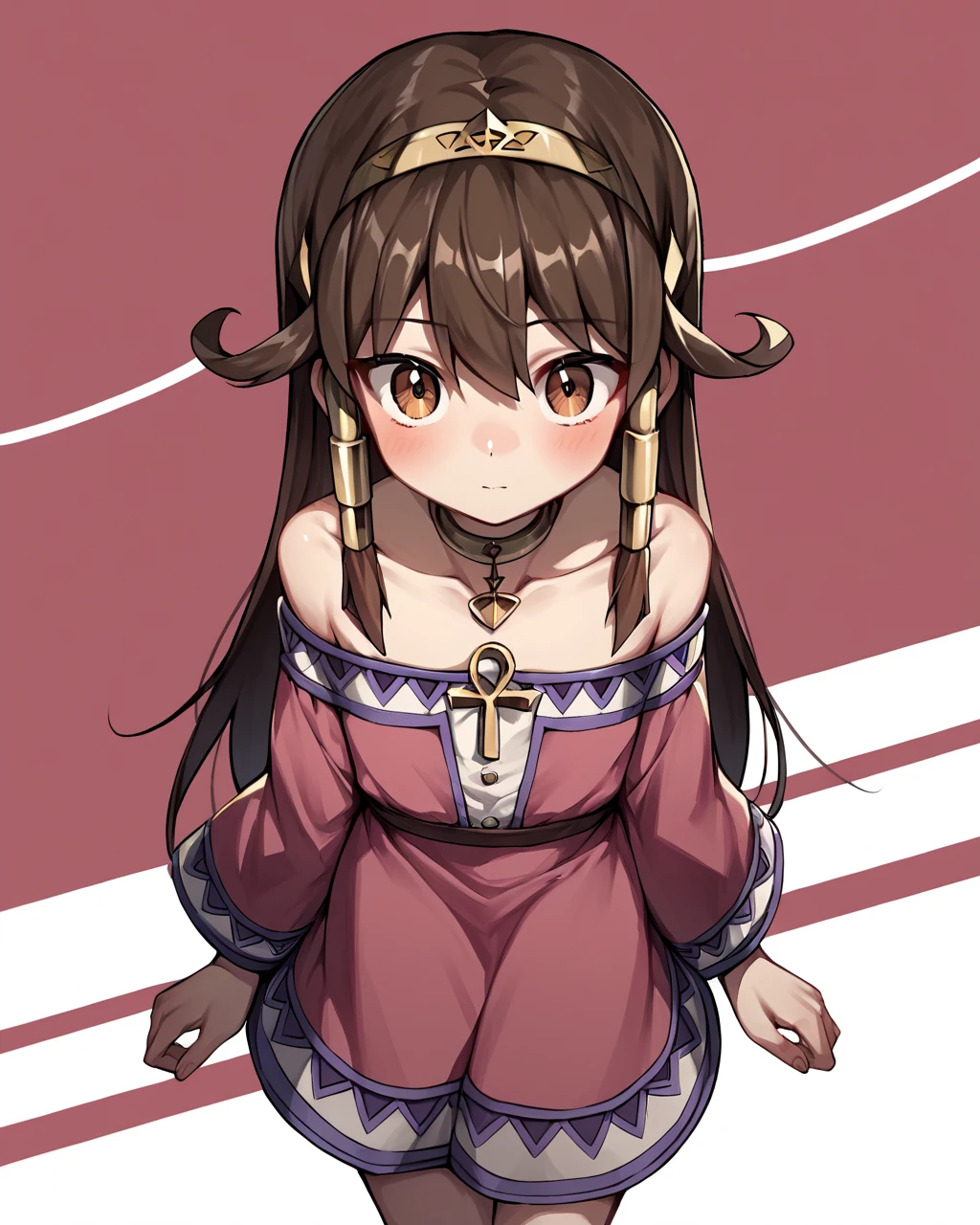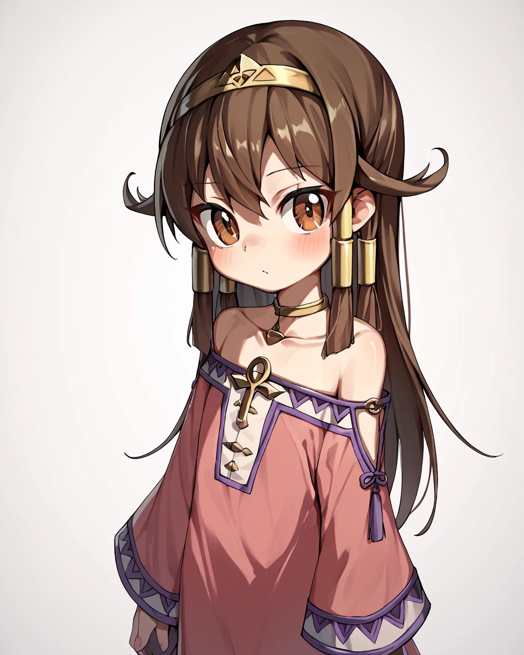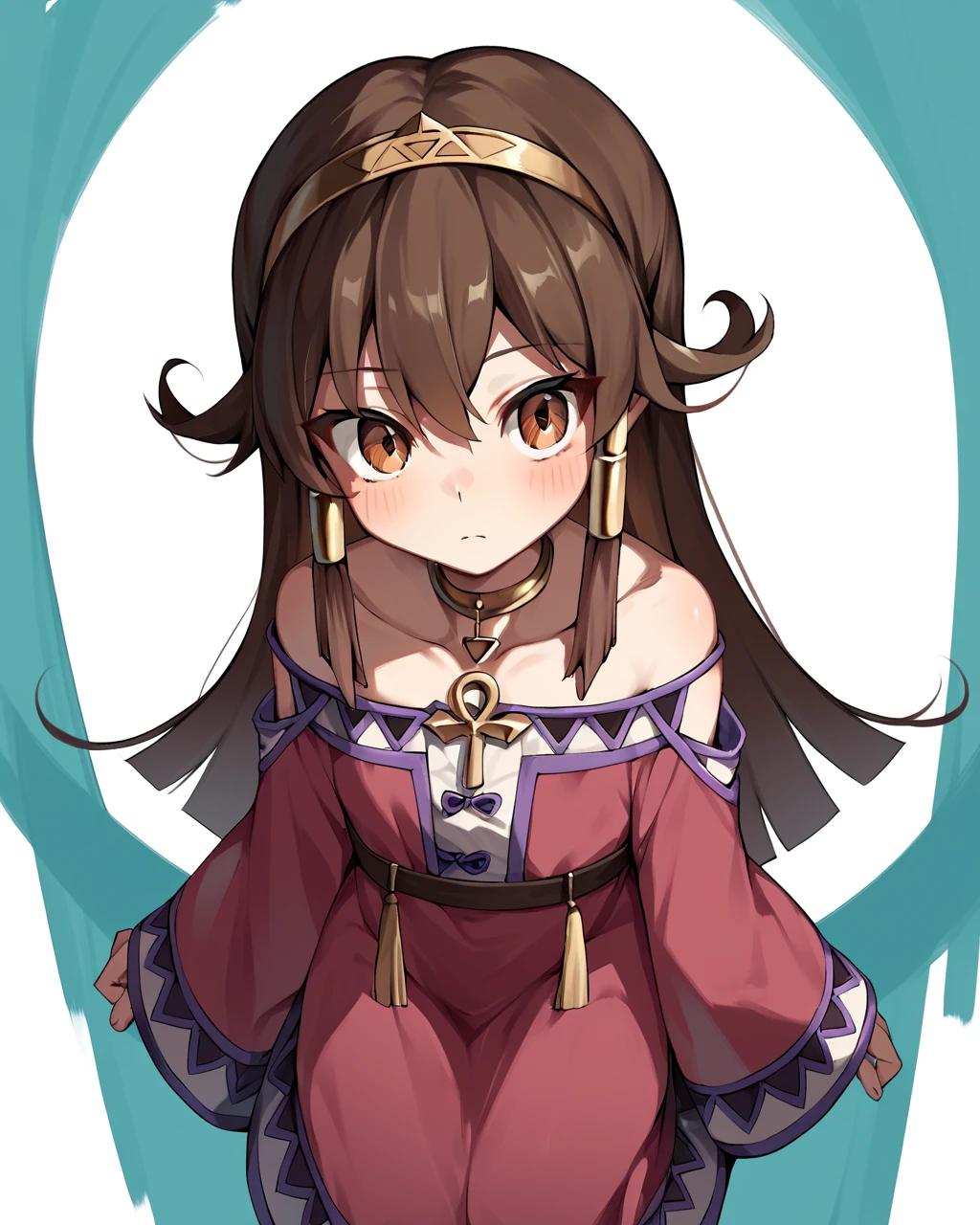 ,sera, 1girl, solo, long hair, brown hair,hairband, brown eyes, hair tubes, jewelry, bare shoulders, dress,