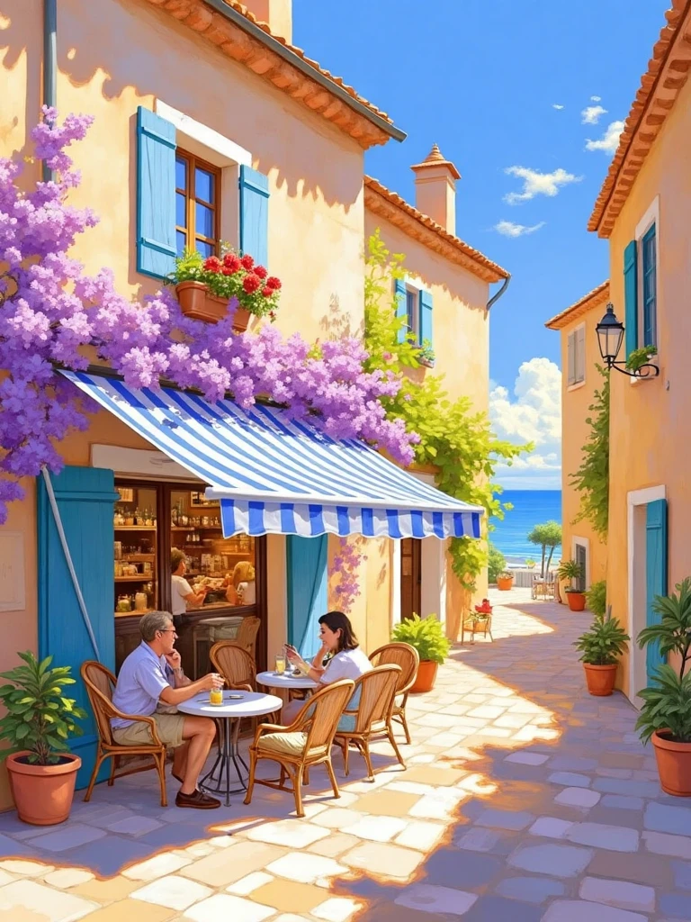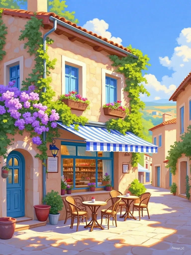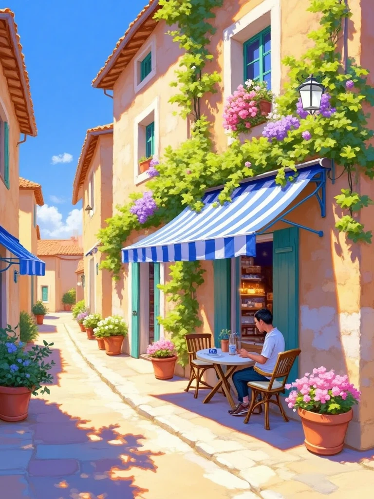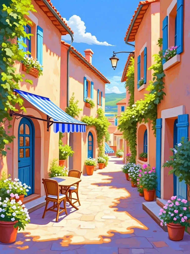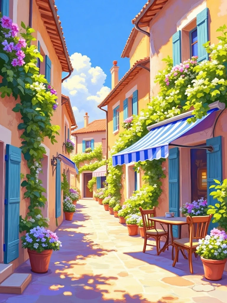 Depict a sunny, floral - lined street scene. Rose - filled courtyards, a café with steaming coffee, a postman delivering letters, clear morning light.