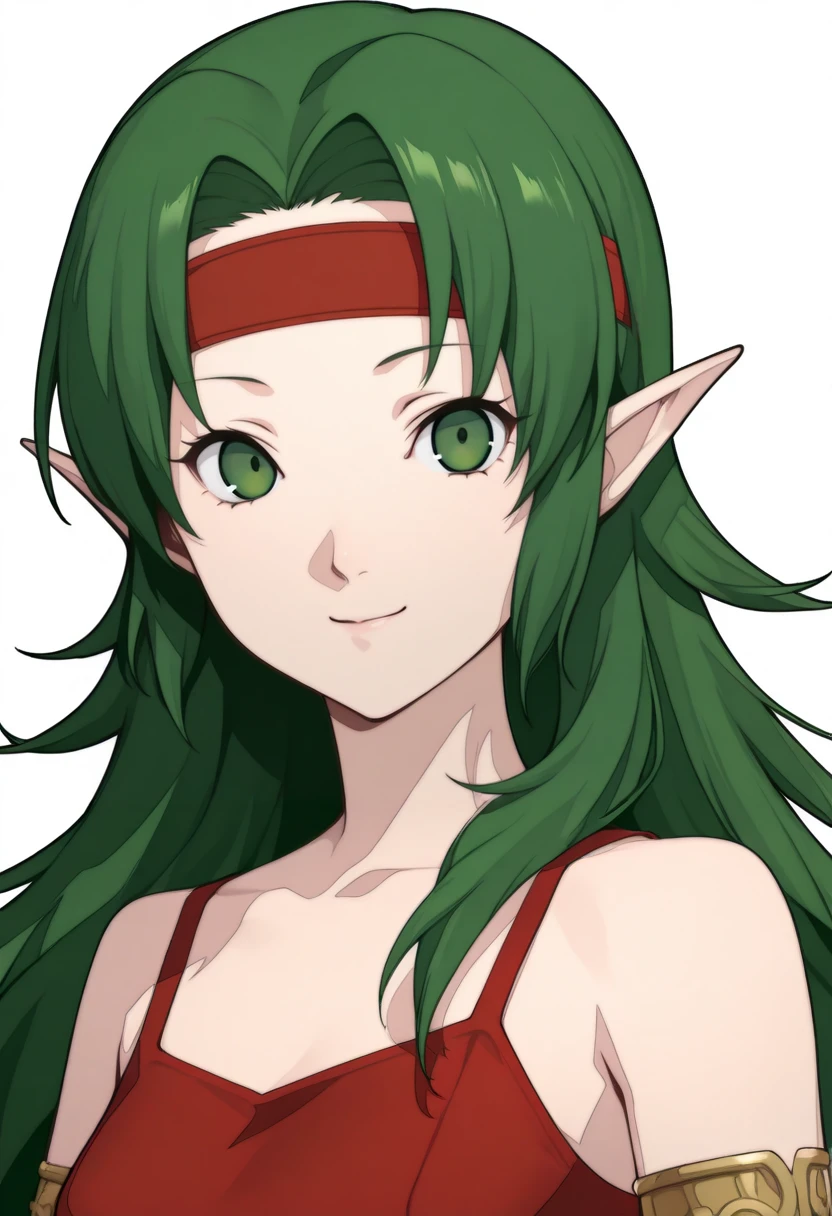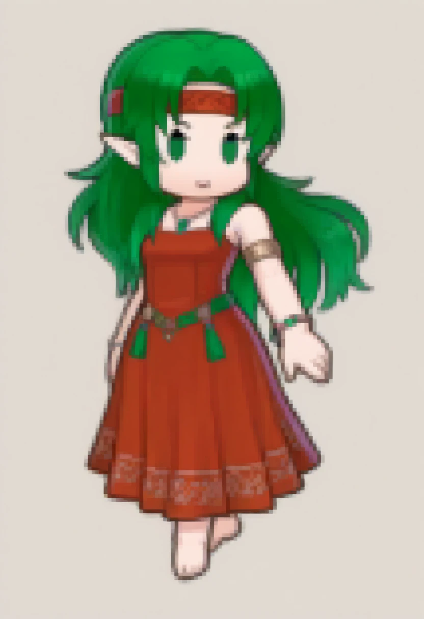 fr3y4smt, green hair, long hair, pointy ears, headband, red dress, jewelry, armlet, barefoot