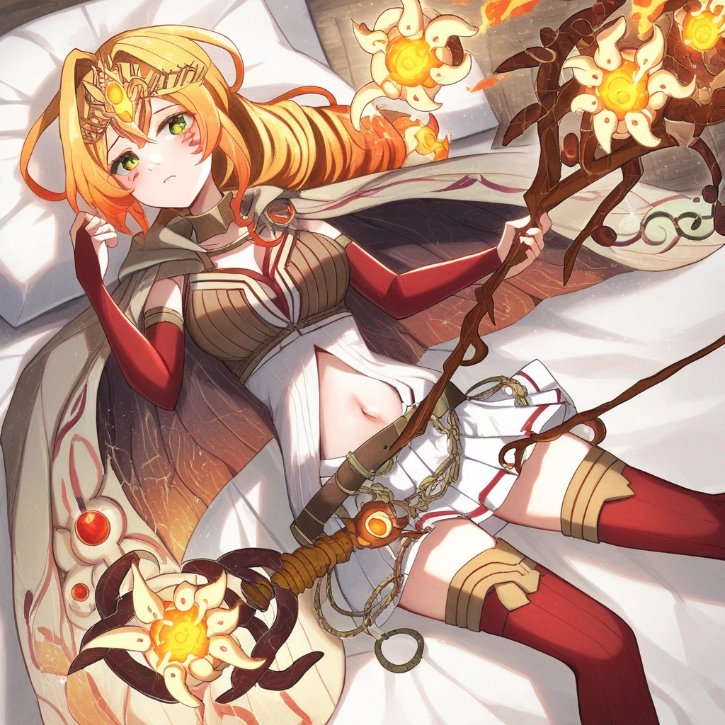 brown crop top, tiara, white pleated skirt, belt, open dress, white dress, stomach cutout, navel, red thighhighs, red bridal gauntlets, spiritual horn cloak,