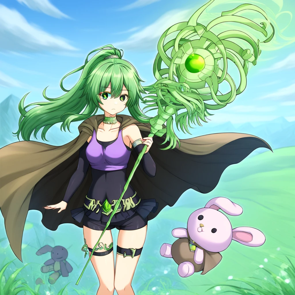 brown cape, jewelry, black shorts, collarbone, purple tank top, black bodysuit, short shorts, black shorts, thigh strap, microskirt, wind staff, stuffed rabbit