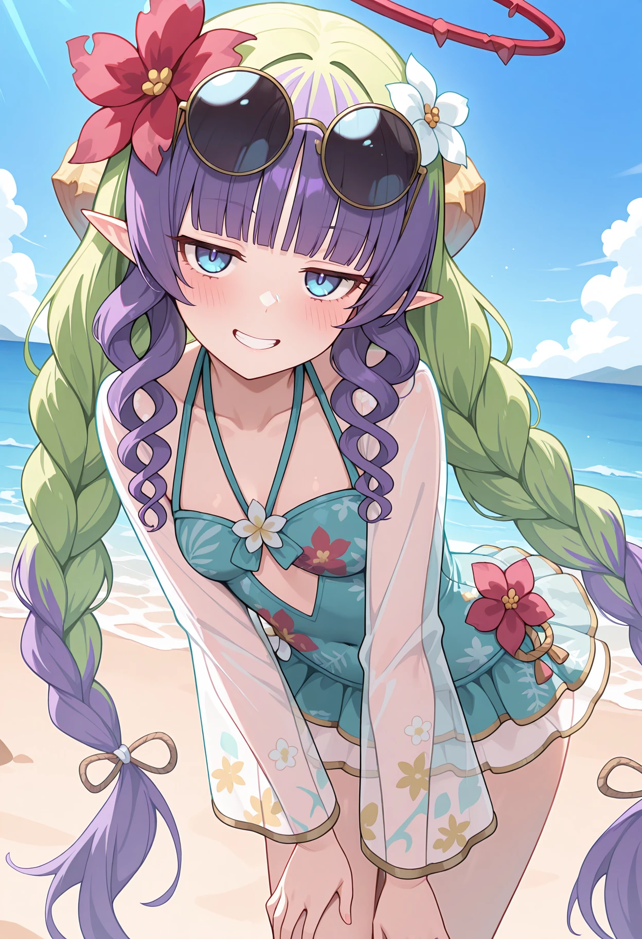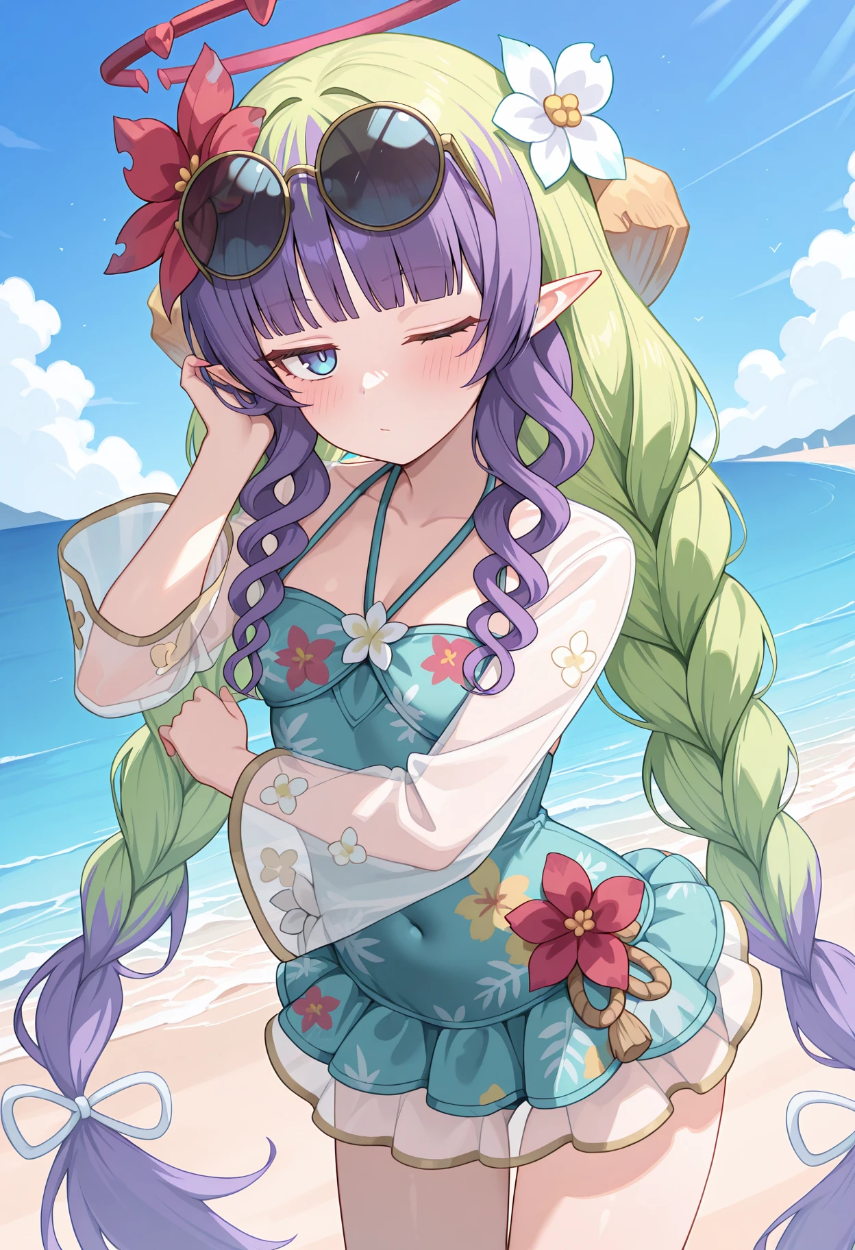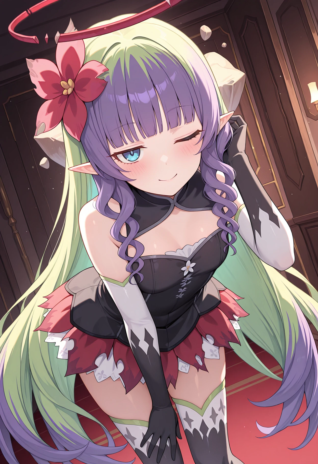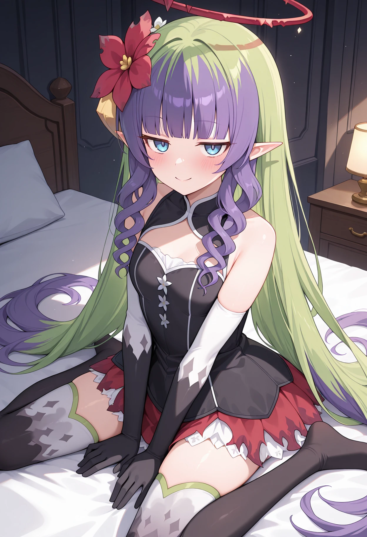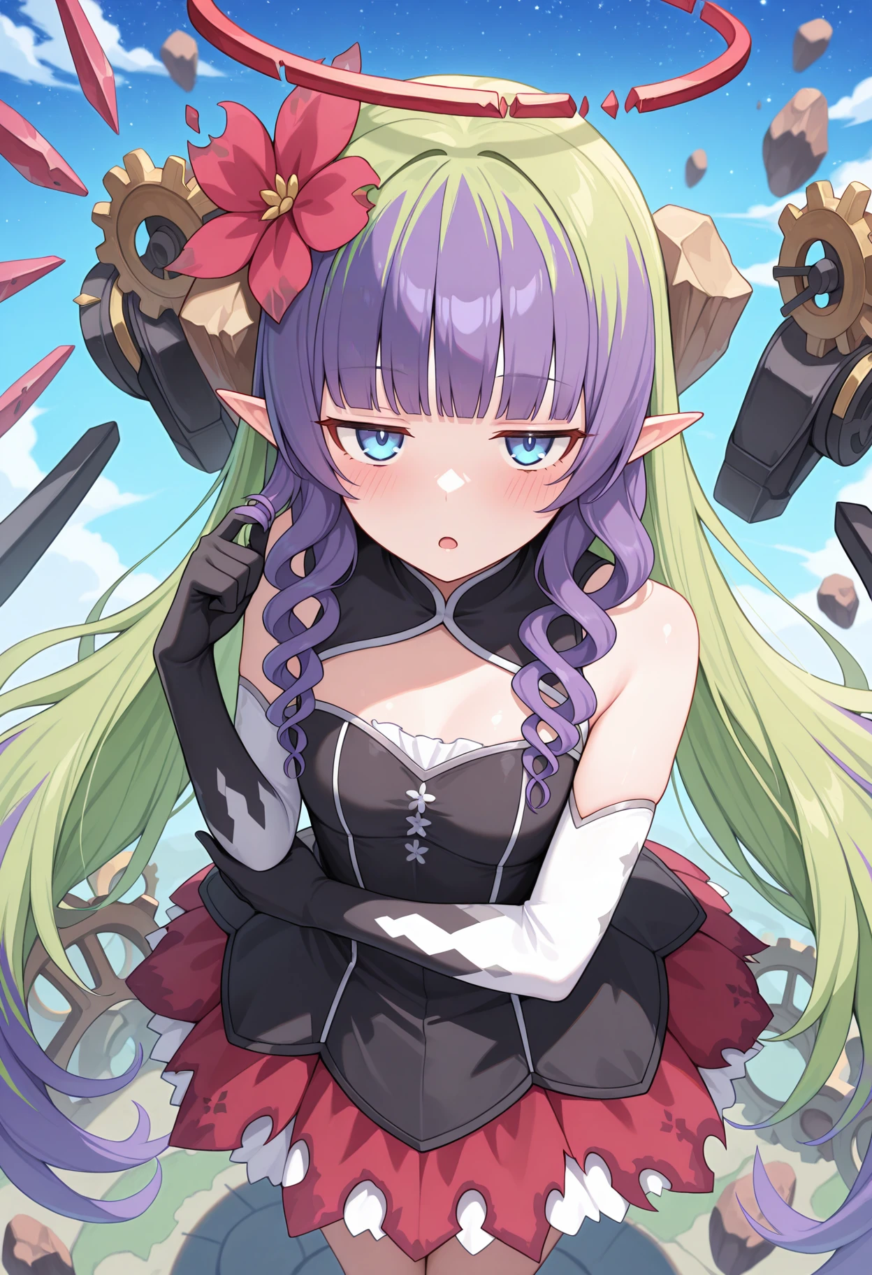 pcramth, very long hair, blunt bangs, purple hair, green hair, two-tone hair, pointy ears, halo, hair flower, red flower, hair ornament, ringlets, blue eyes, jitome,