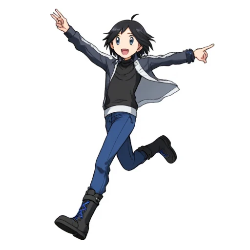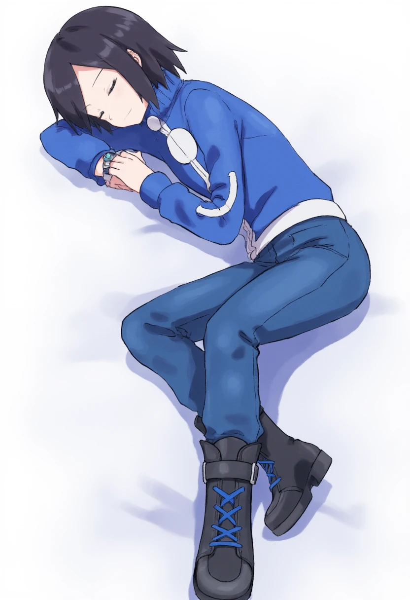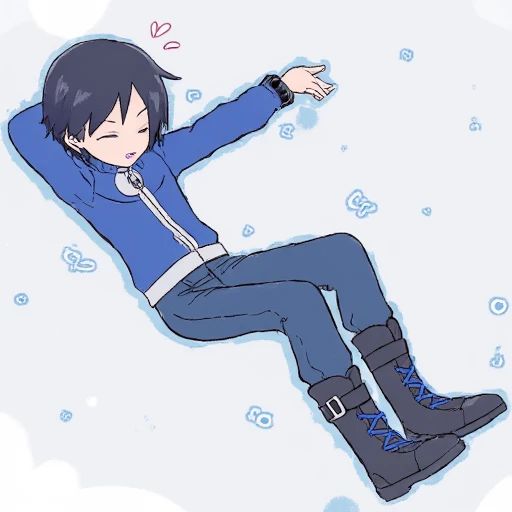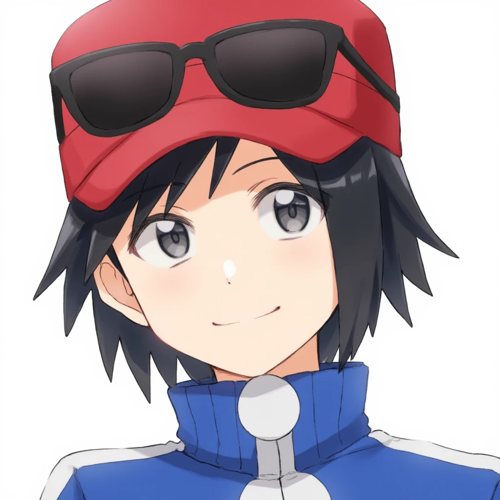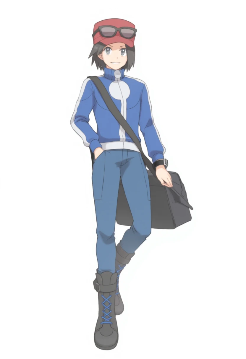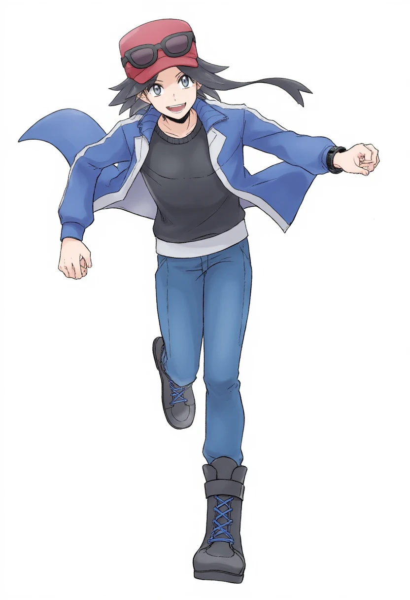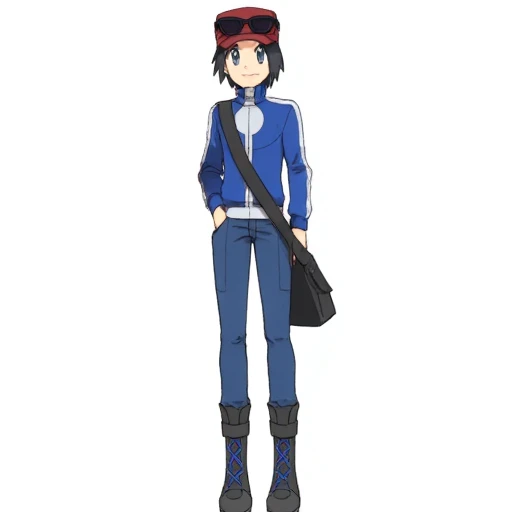 Clothing: blue jacket, blue pants, red headwear, eyewear on headwear, sunglasses, boots, black footwear