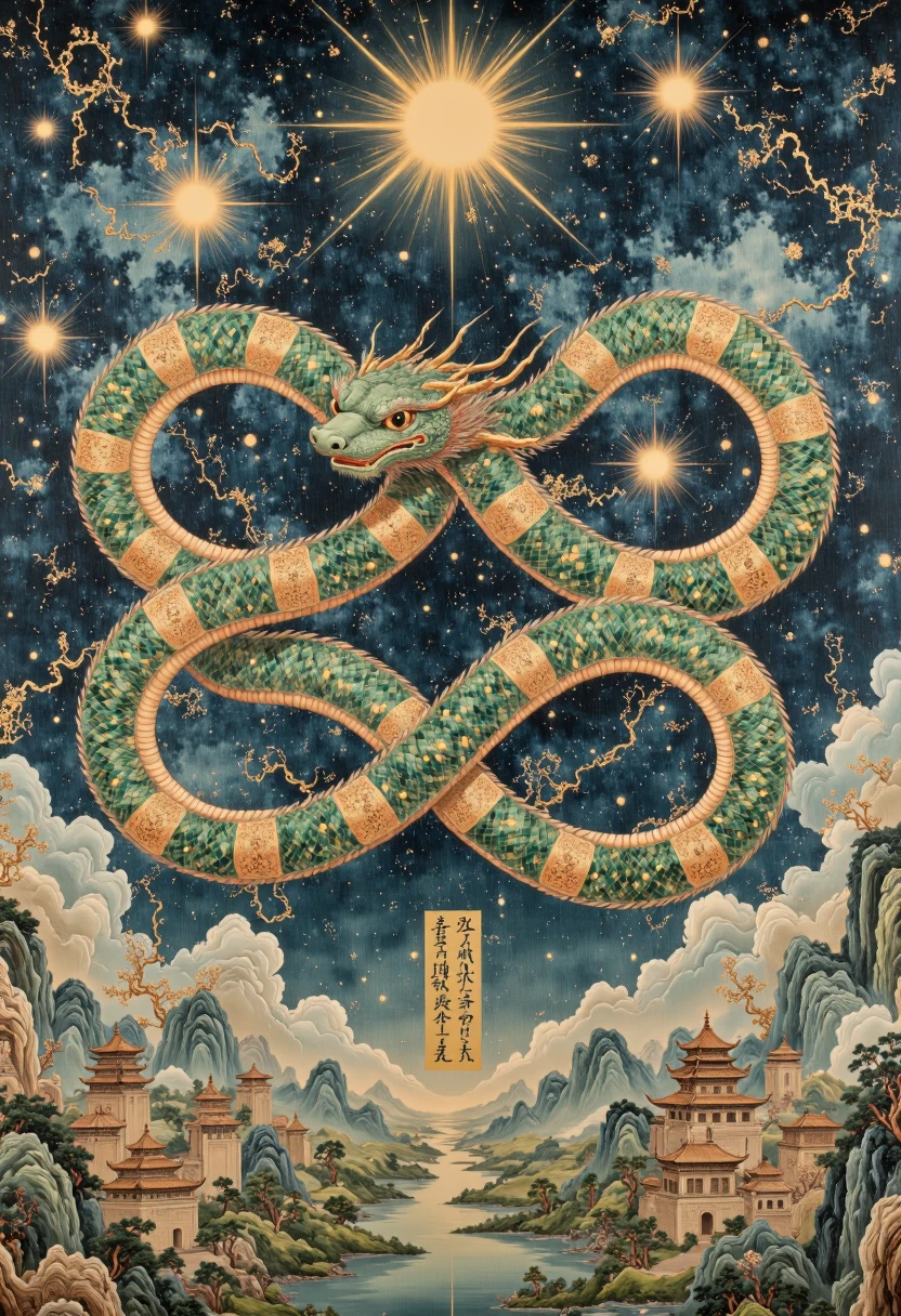 • Detailed Ornamentation: Serpents adorned with intricate scales resembling calligraphy or embroidery.