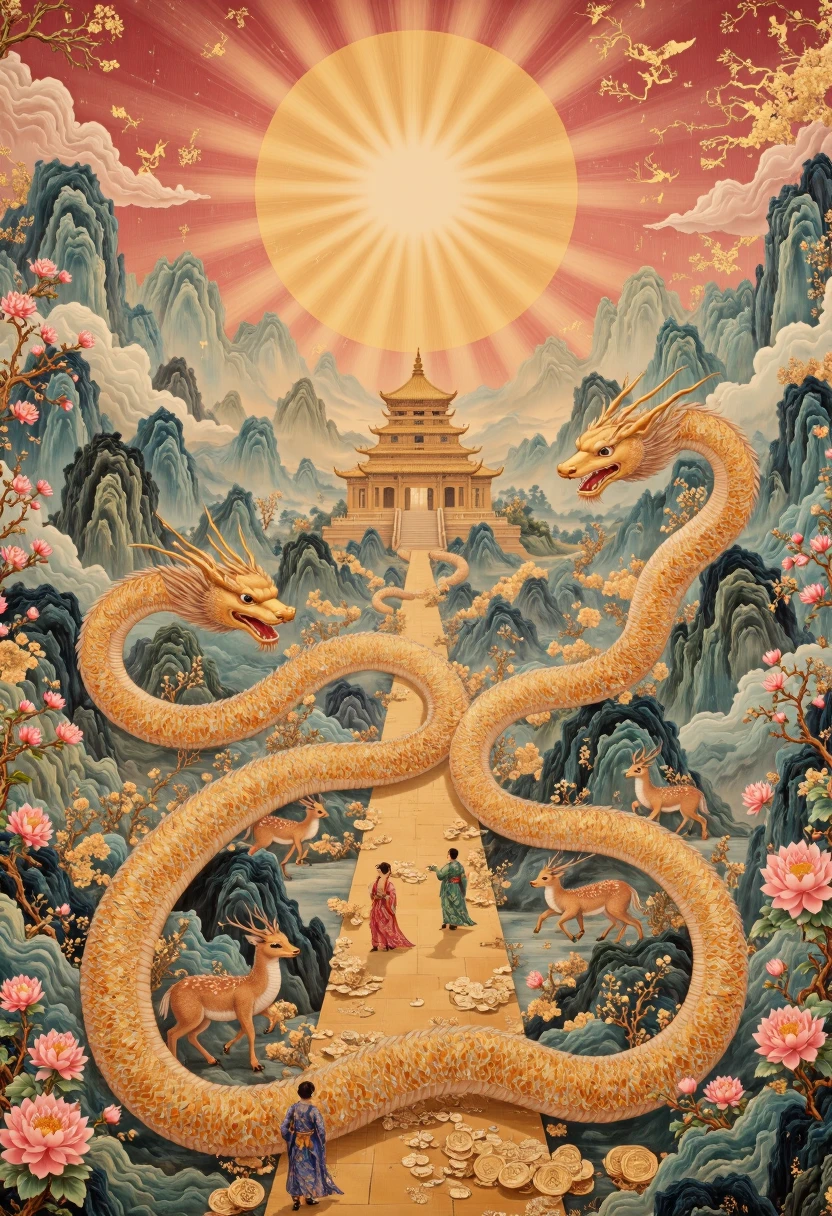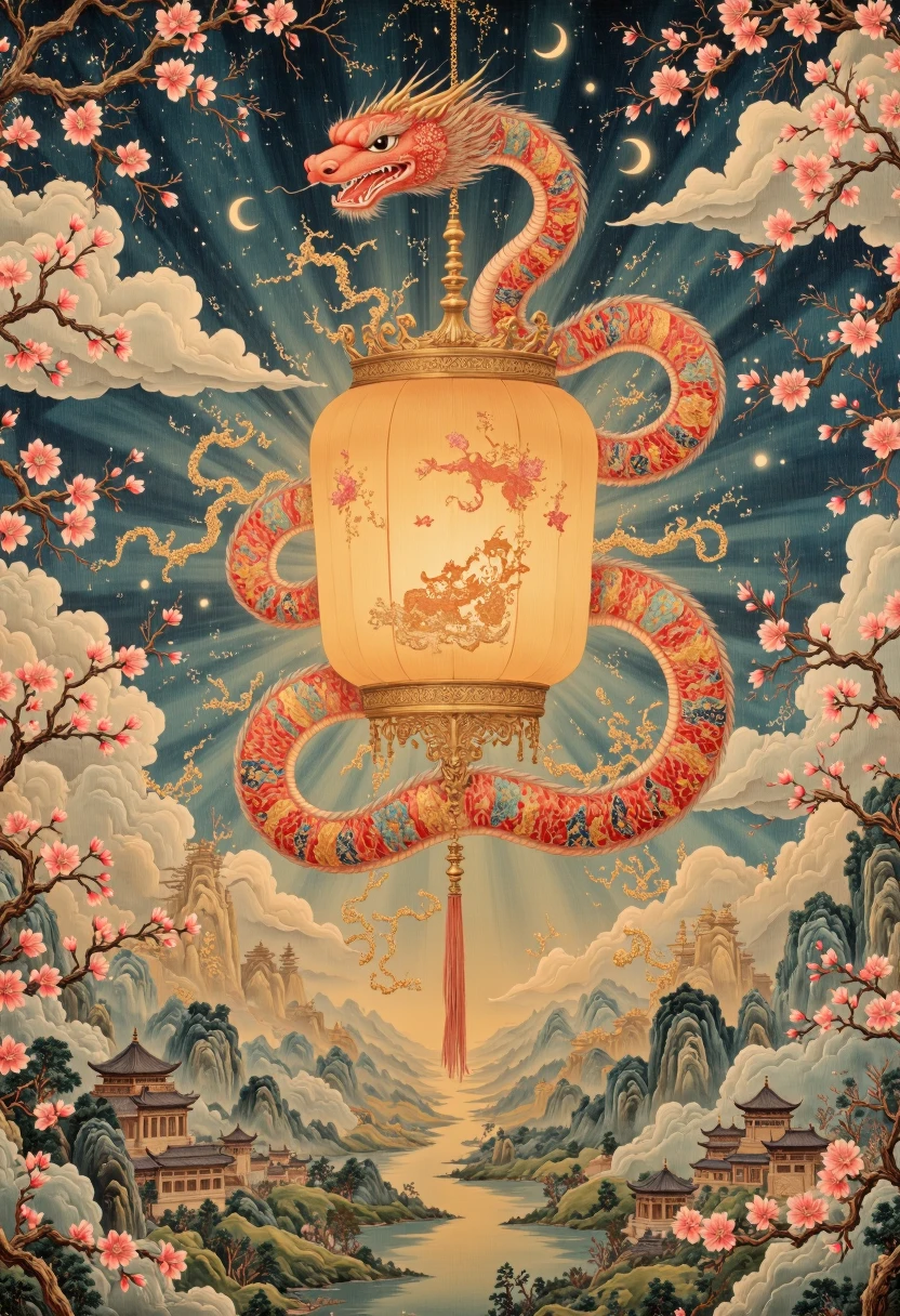 • Color Palette: Soft gradients of jade greens, golds, fiery reds, and calming blues, reminiscent of traditional Sinosphere aesthetics.