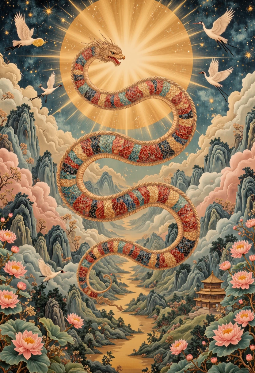 • Mythological Essence: Inclusion of phoenixes, dragons, cranes, and divine maidens interacting with serpents in symbolic, celestial settings.