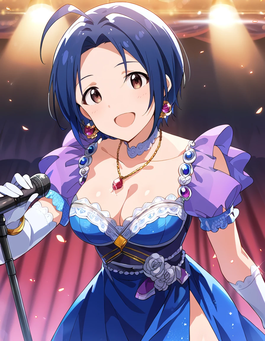 murazs, short hair, blue hair, ahoge, brown eyes, red eyes, large breasts,