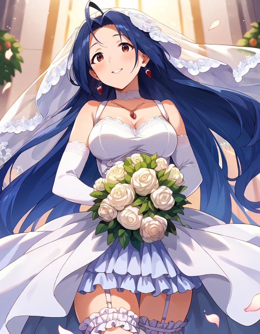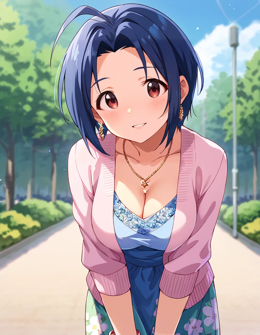 murazs, short hair, blue hair, ahoge, brown eyes, red eyes, large breasts, Description