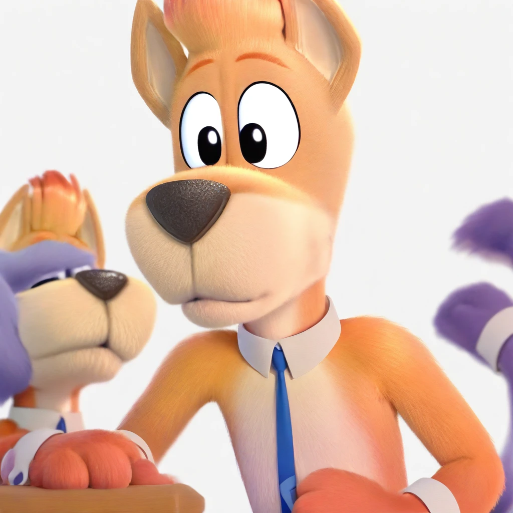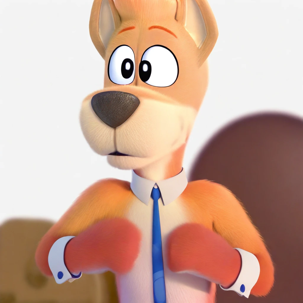 tenor, male, furry male, anthro, solo, dog, orange fur, two-tone fur, orange hair, short hair, highlights, black eyes, tan muzzle, brown nose, pointy ears, paw pads, tail, collar, blue tie, white shirt cuffs