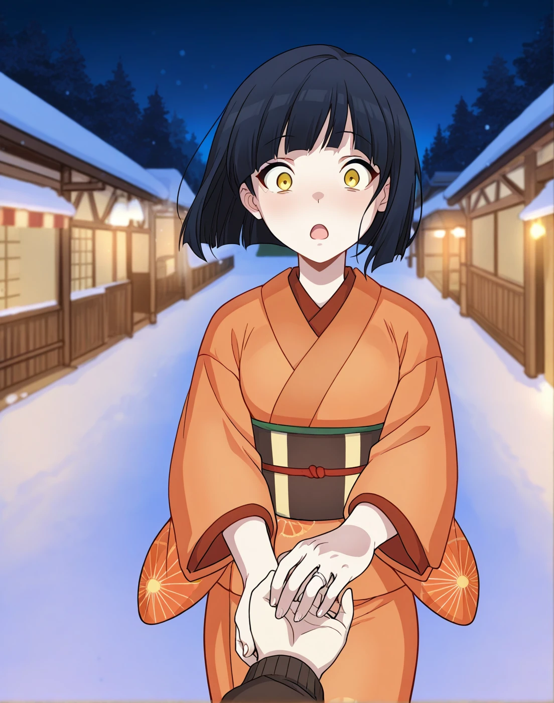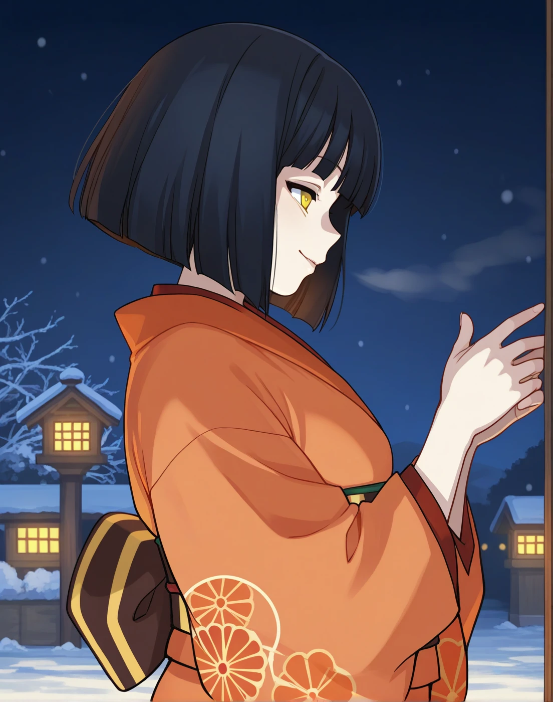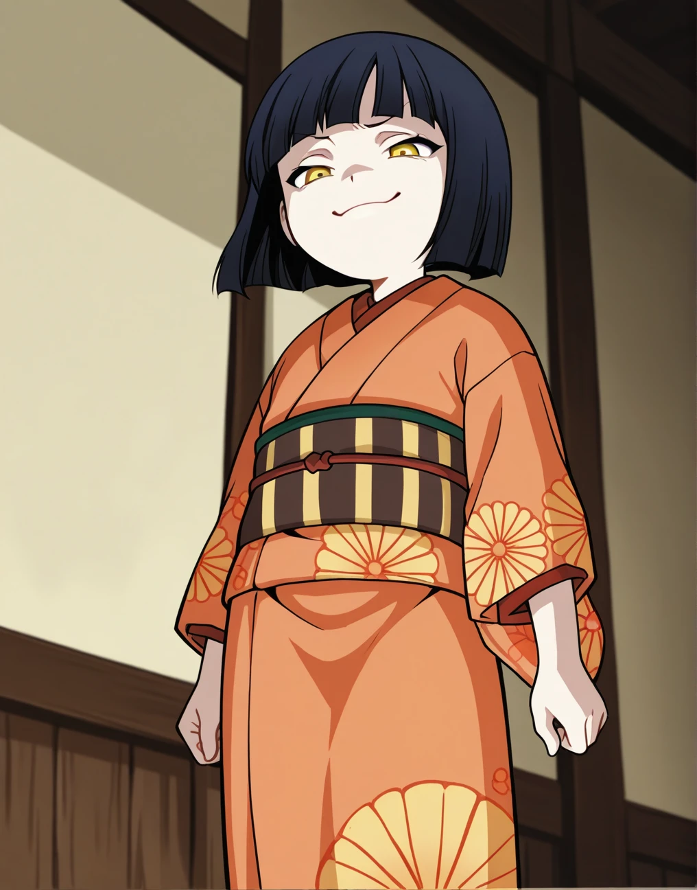 recommend: short hair, orange kimono, japanese clothes, bob cut, yellow eyes,