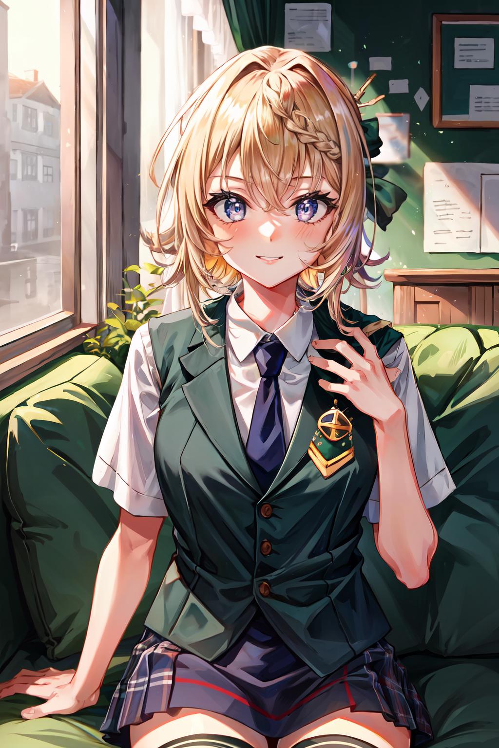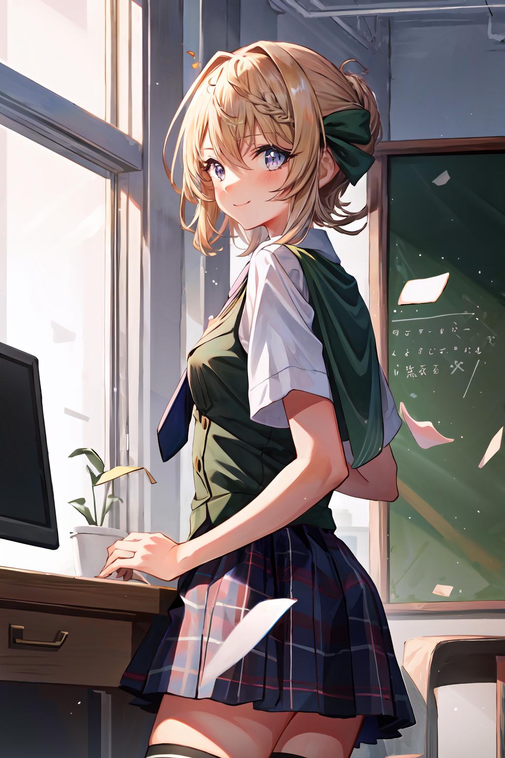 PerthKC, school uniform, (white) short sleeves, shirt, (green) vest, (blue) pleated dress skirt, plaid, (blue) necktie, (green) thighhighs, ribbon, loafers, badge, (green) cape, cloakSome additional tags that you may use for reference