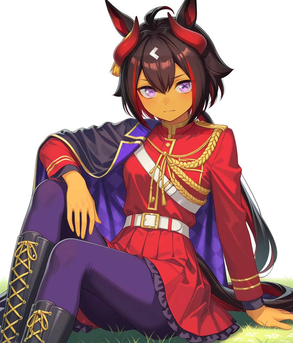 勝負服: Osaichi George, cape, black knee boots, purple pantyhose, skirt, horns, red uniform