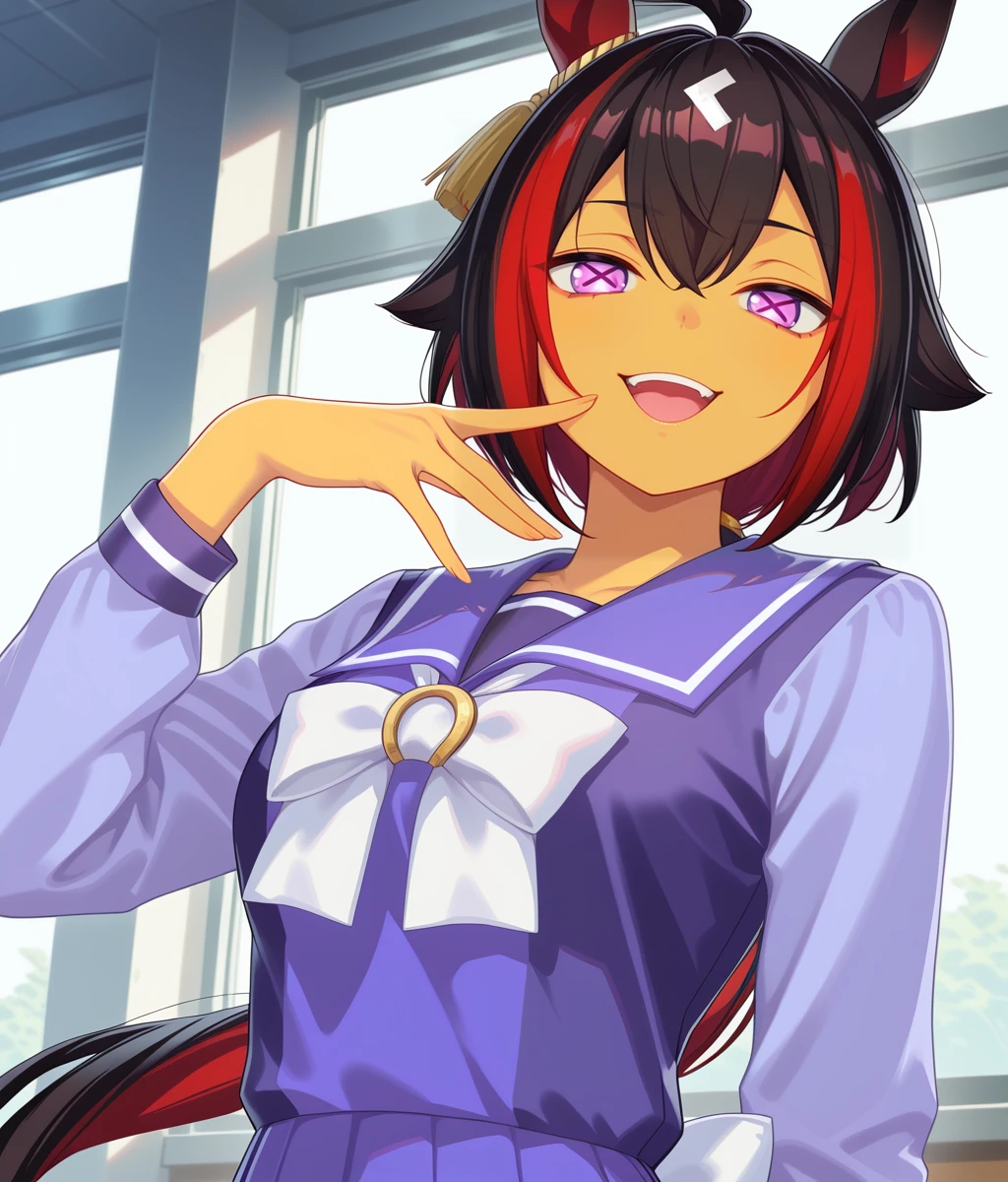 Base: mill wakaba \(umamusume\), dark-skinned female, low ponytail, multicolored hair, x-shaped pupils