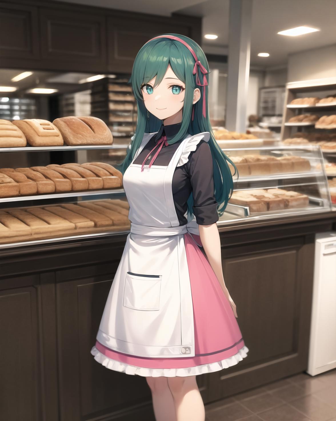 black shirt, white apron, pink skirt, long skirt, brown shoes,