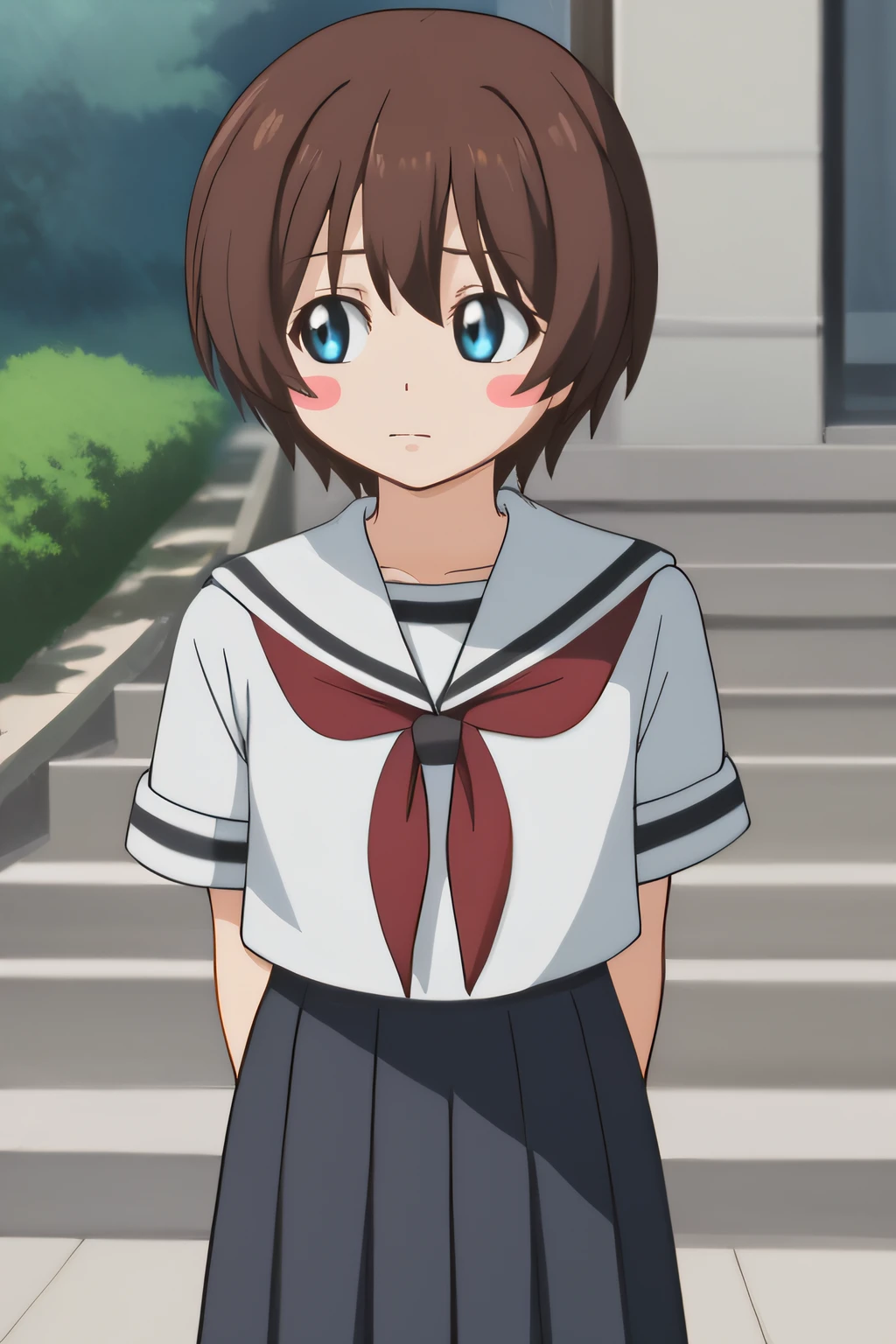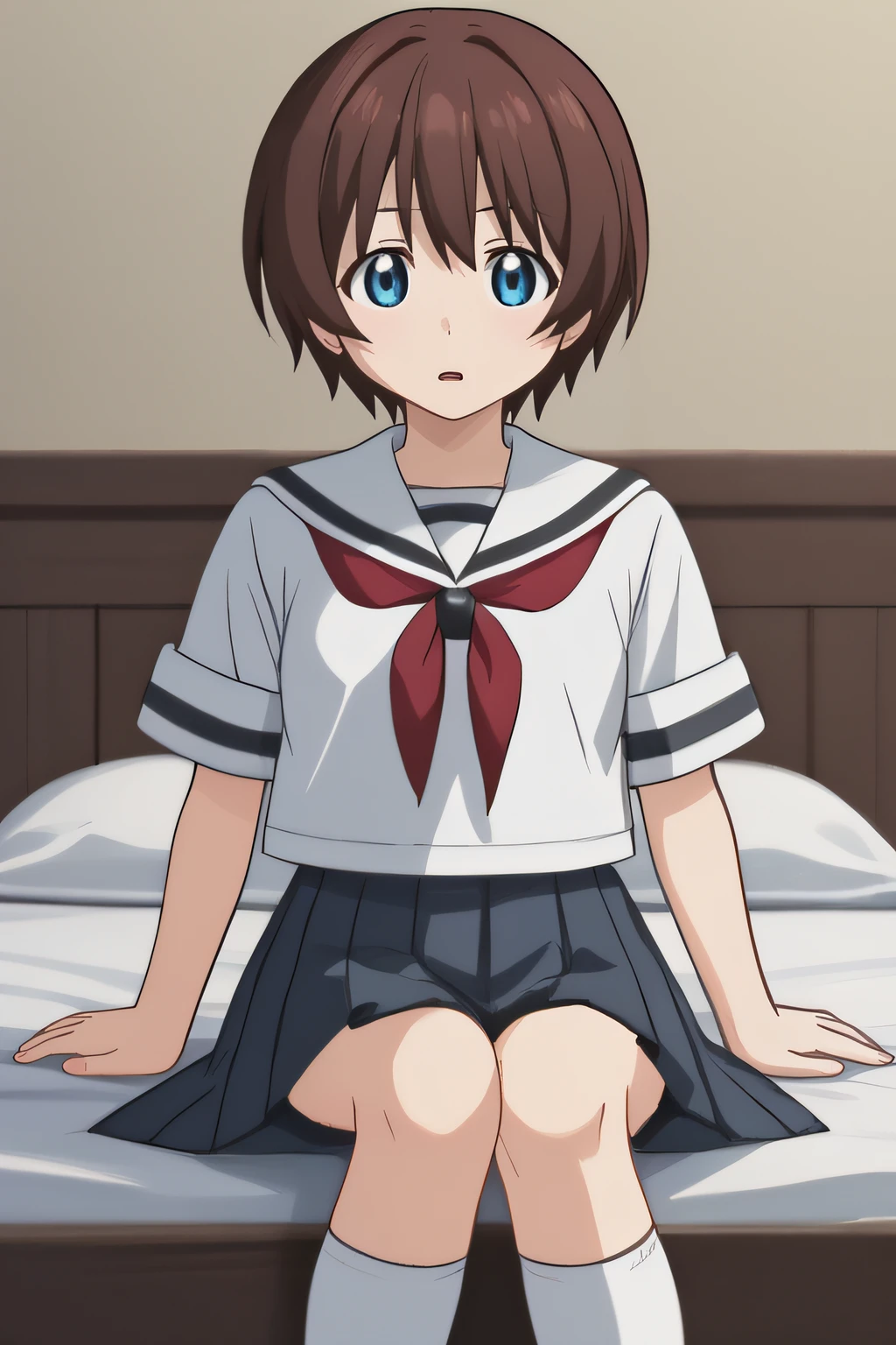 yurie, brown hair, short hair, closed eyes, white serafuku, red neckerchief, black pleated skirt
