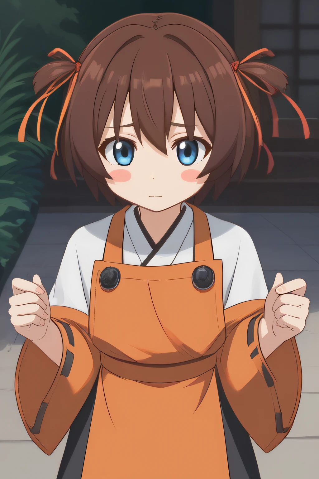 yurie, brown hair, short hair, blue eyes, red_hair_ribbon, two side up, layered clothes, white shirt, red neckerchief, (orange sleeves), wide sleeves, japanese clothes, orange apron, black skirt