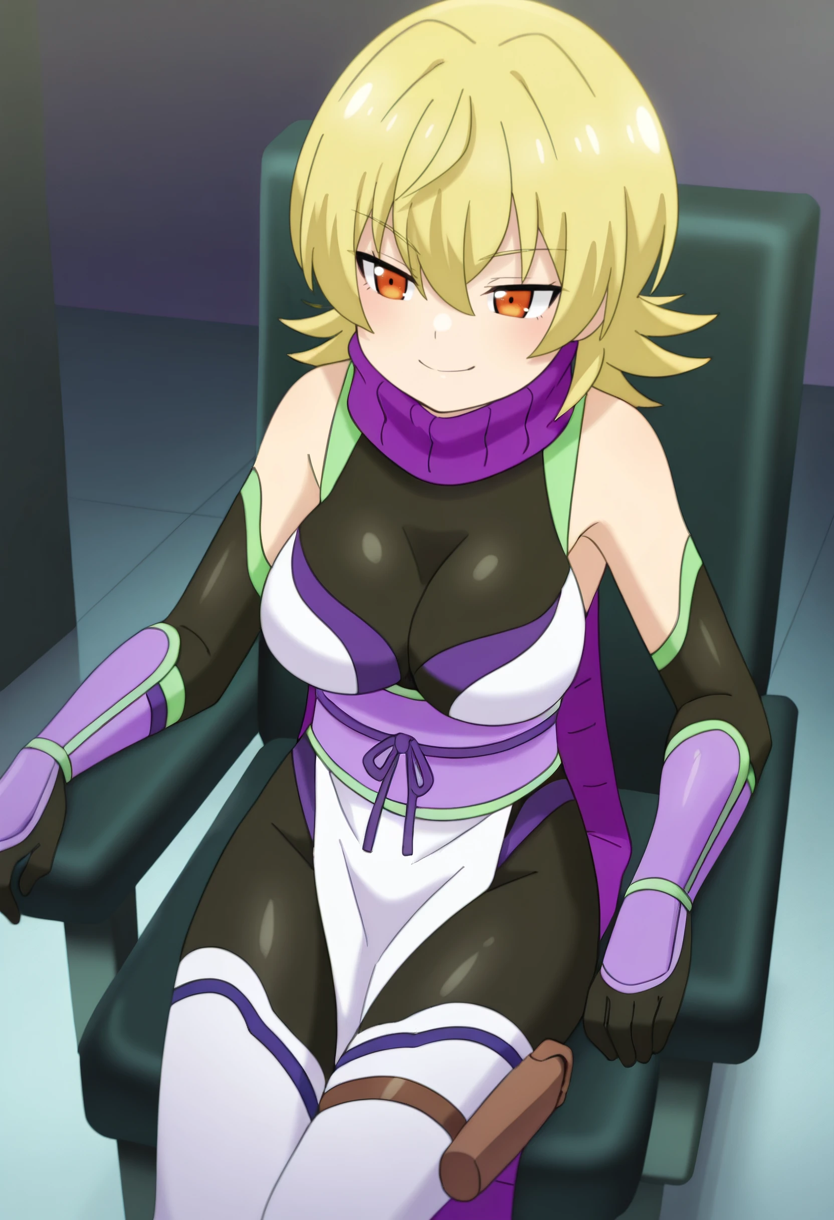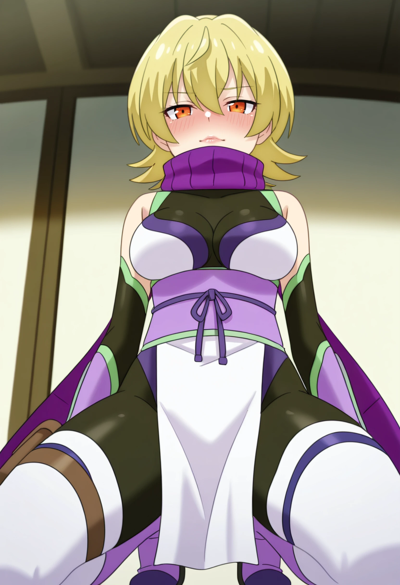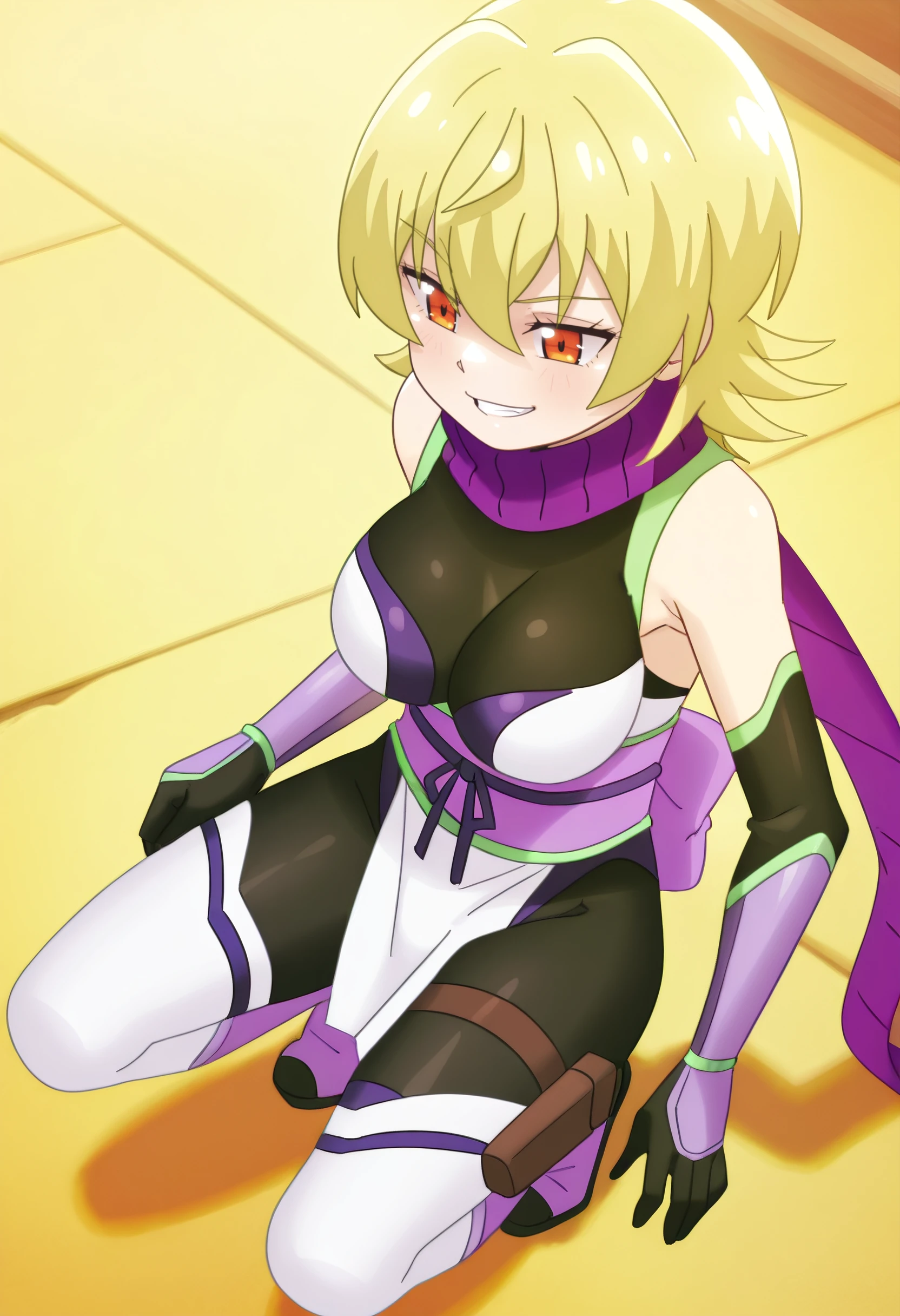 YuzuBodysuit, purple scarf, ninja, bare shoulders, elbow gloves, bodysuit, sleeveless, black gloves, leotard, detached sleeves, black bodysuit, obi, pelvic curtain, boots, thighhighs, black leotard, white thighhighs, thigh strap, thigh holster, pink footwear, pink sash,