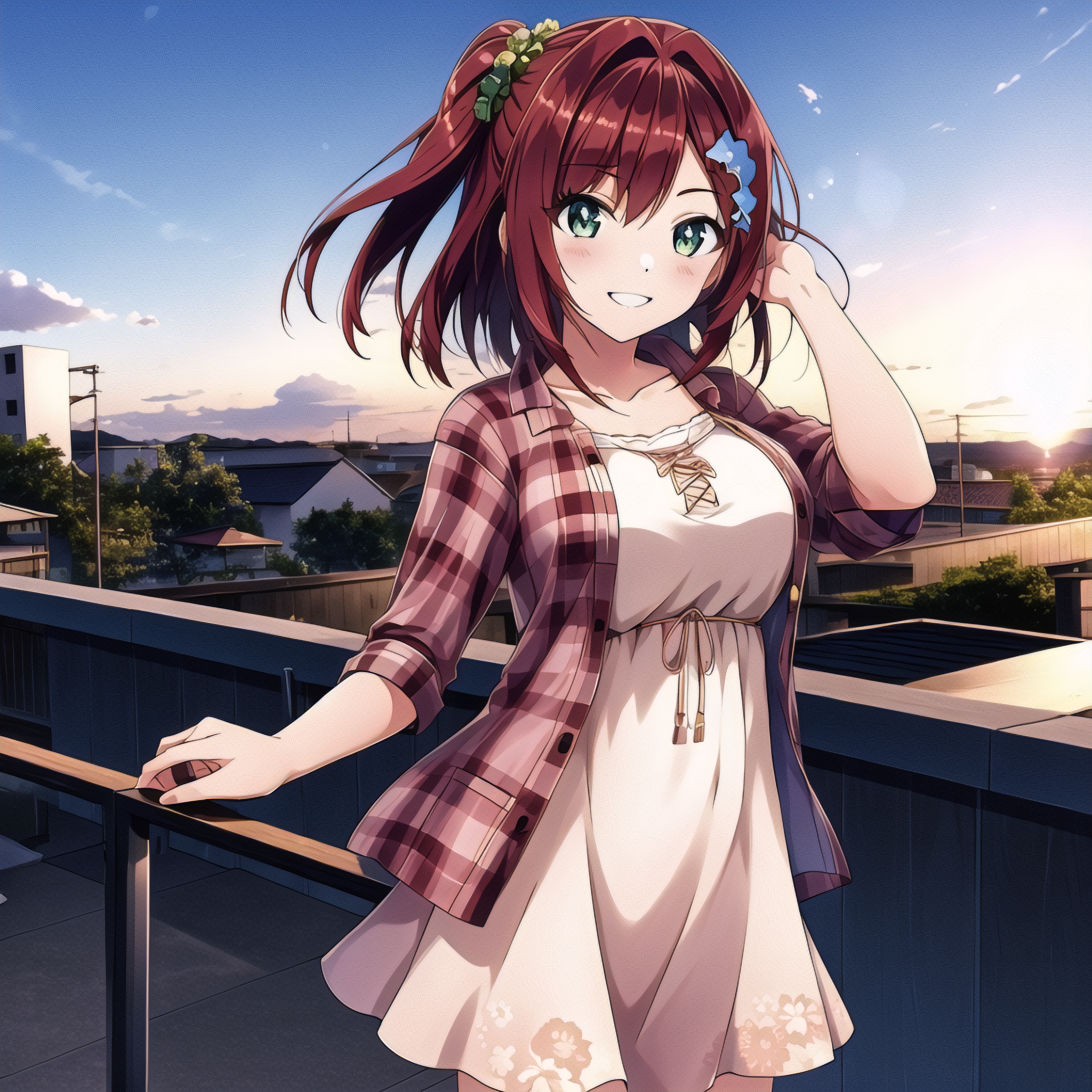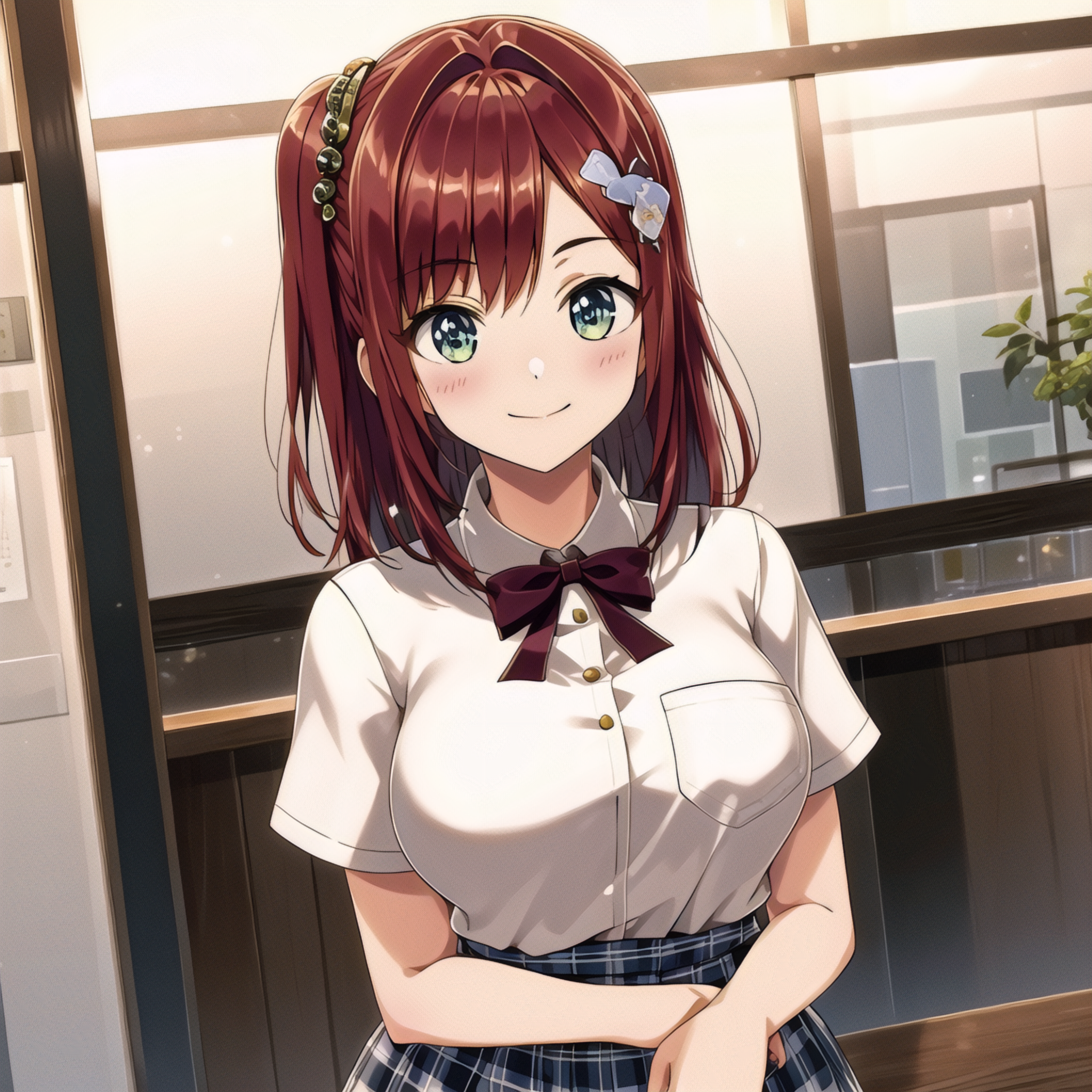 Adding one_side_up tag helps with the hair; hair_clip tag is optional