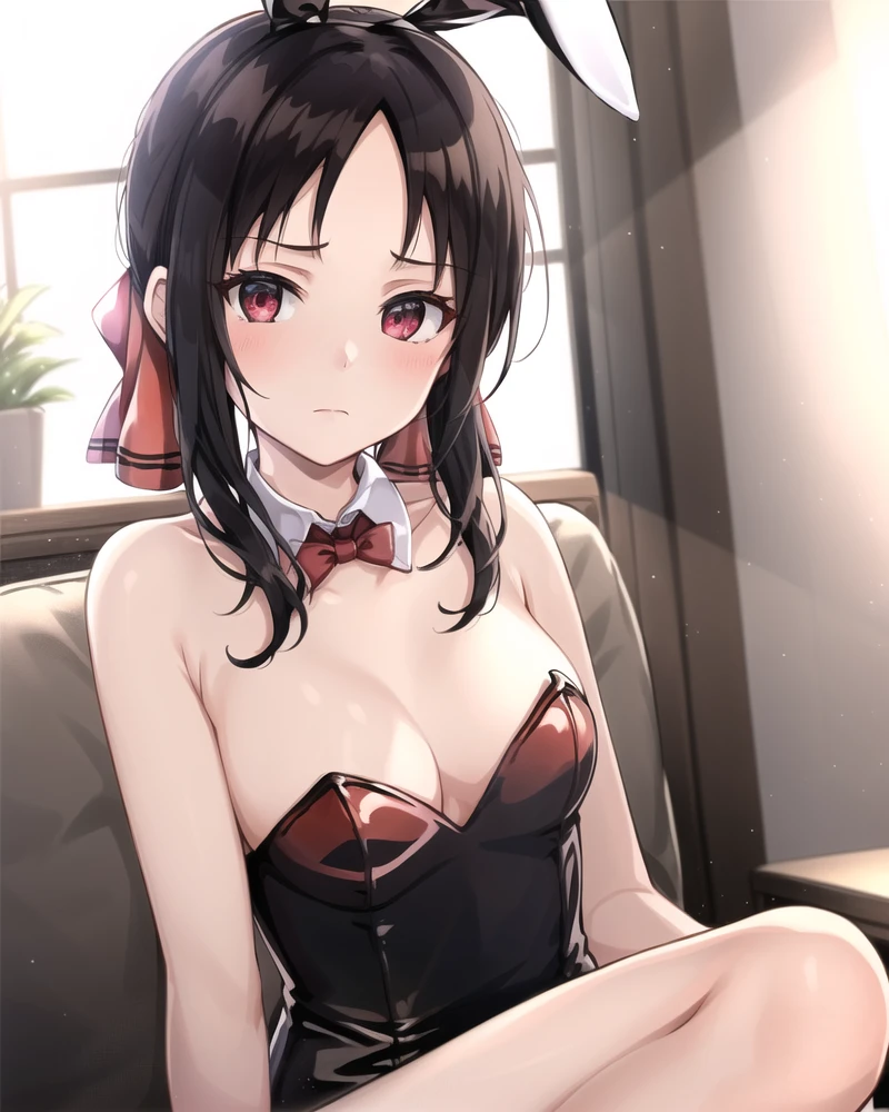 shuuchiin_academy_uniform, shinomiya_kaguya, red_ribbon, ribbon, school_uniform, dress, black_hair, solo, folded_ponytail, hair_ribbon, red_eyes,