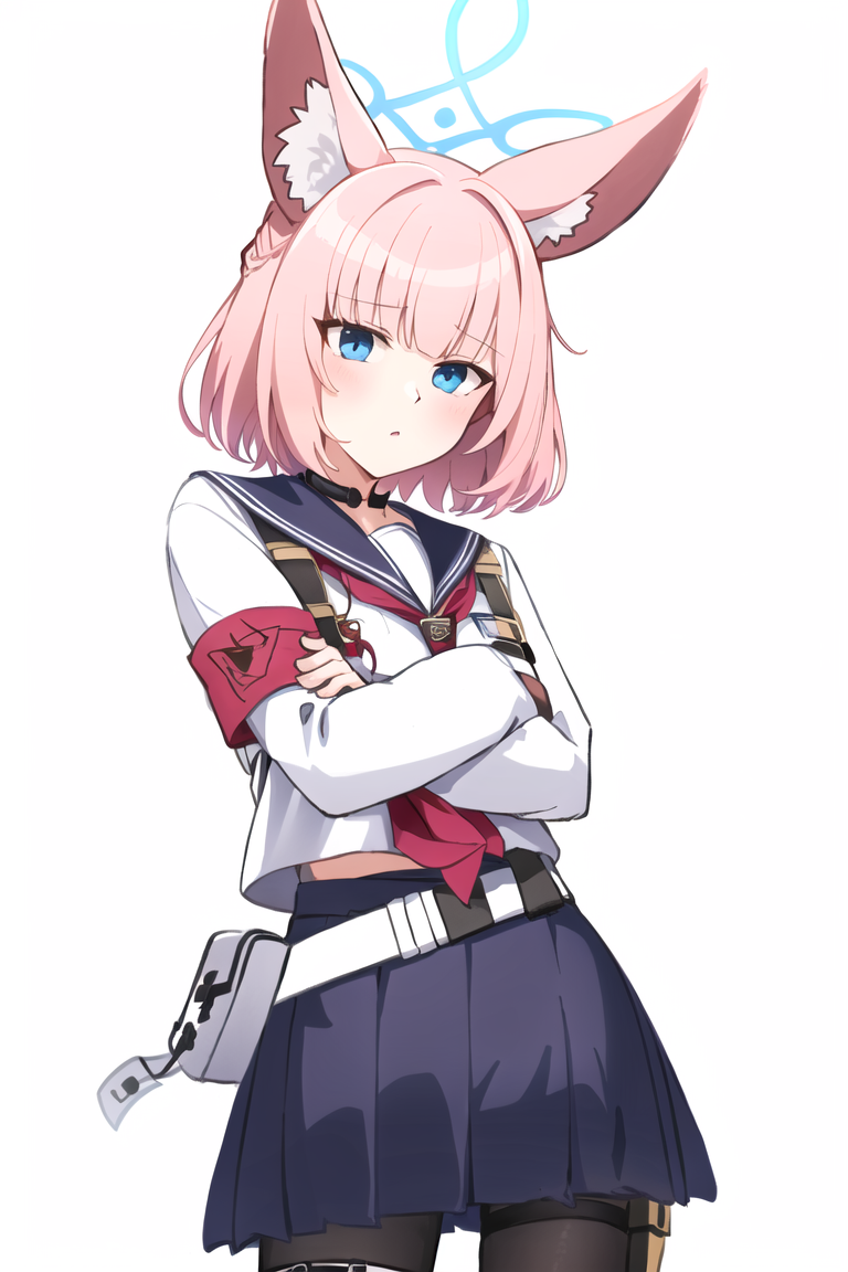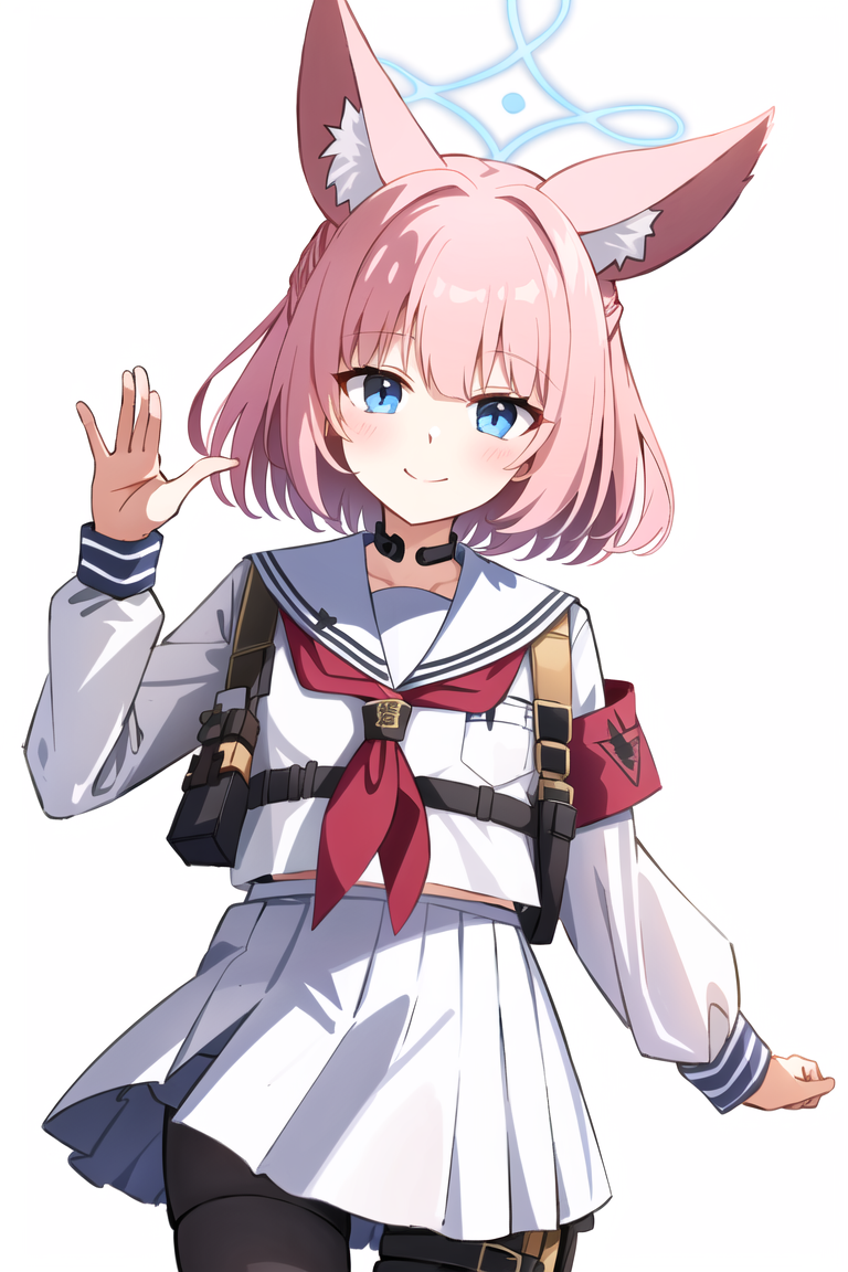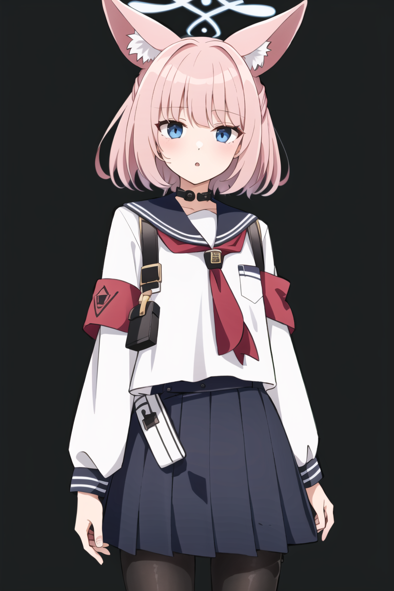 recommended prompt: niko, 1girl, short hair, blue eyes, animal ears, school uniform, pink hair, pantyhose, fox ears, halo, armband, holster