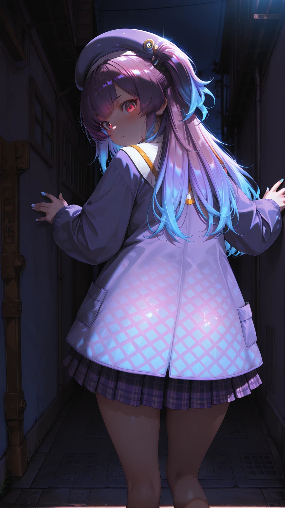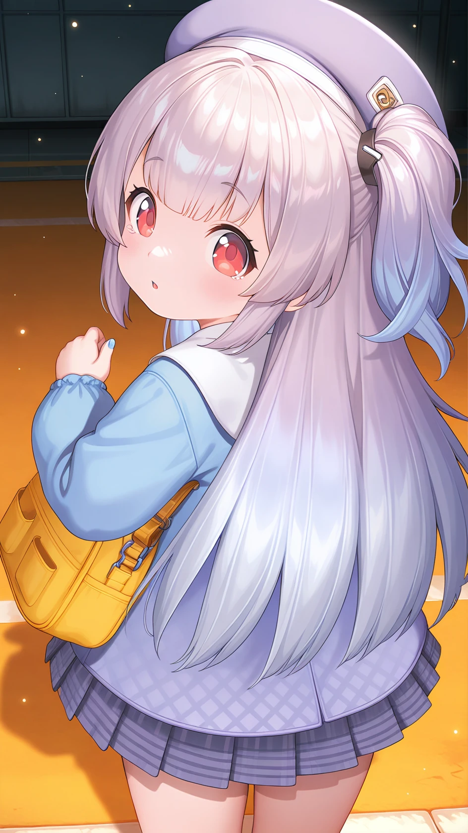 1girl, long hair, blush, bangs, red eyes, long sleeves, hat, one side up,, purple hair, grey hair, multicolored hair, blue headwear, blue nails, purple headwear, kindergarten uniform, skirt, pleated skirt, shoes, socks, black footwear, plaid, beret, plaid skirt, white socks