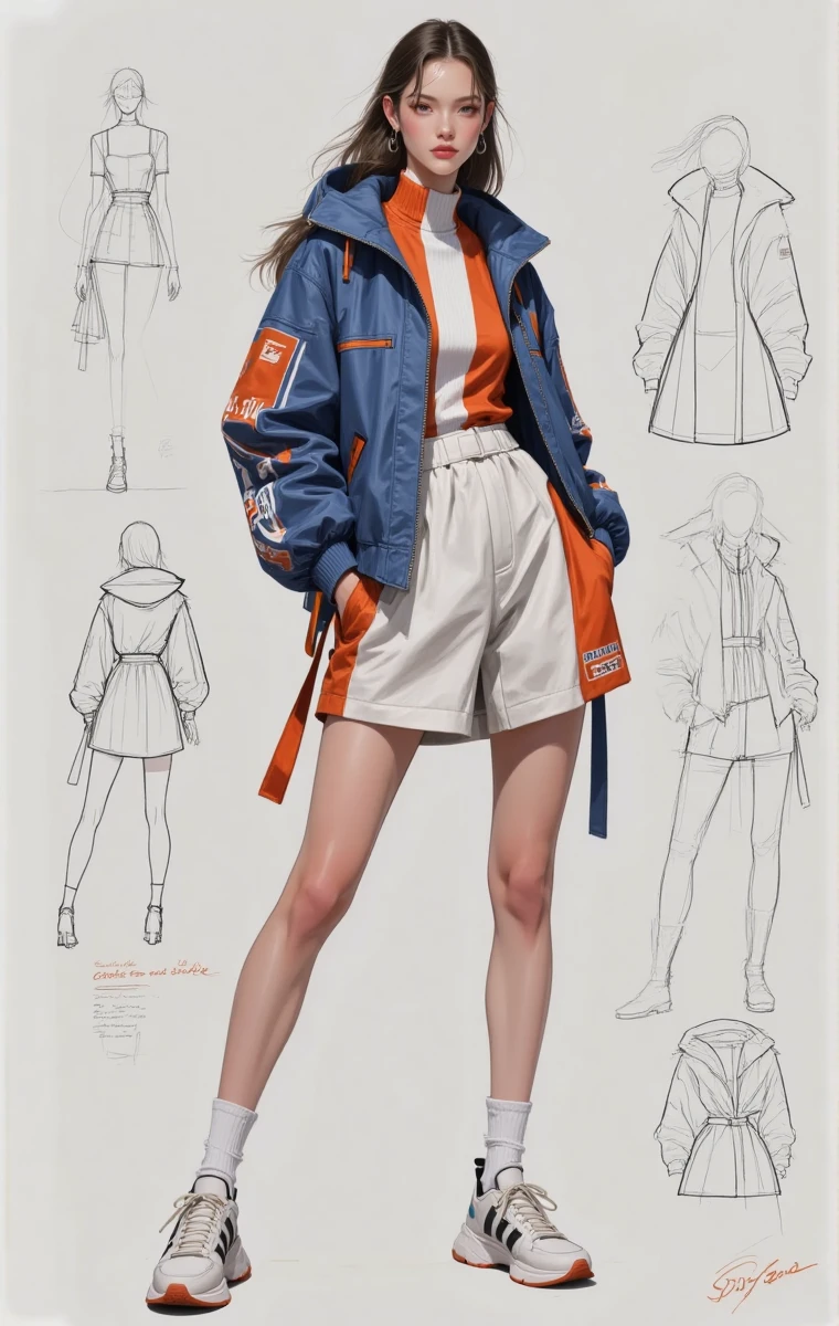 Fashion design sketch, a character sketch in the upper left corner, a clothing sketch in the lower left corner, a girl, sportswear