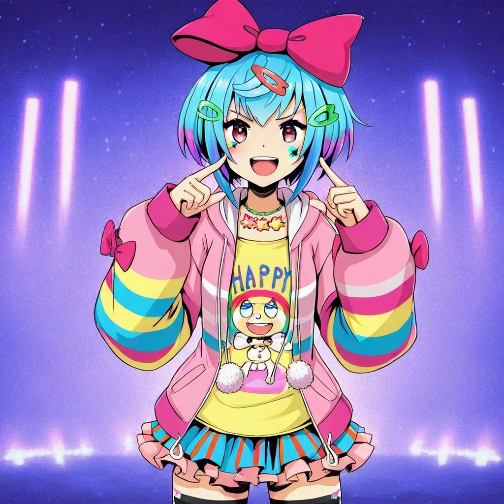 Light blue hair, dark red eyes, large dark pink hair ribbon, 3 hairpins, light blue star mark under one eye, pink hoodie, colorful hoodie, yellow shirt with "HAPPY" character printed on it, colorful skirt, yellow knee socks, pink shoes