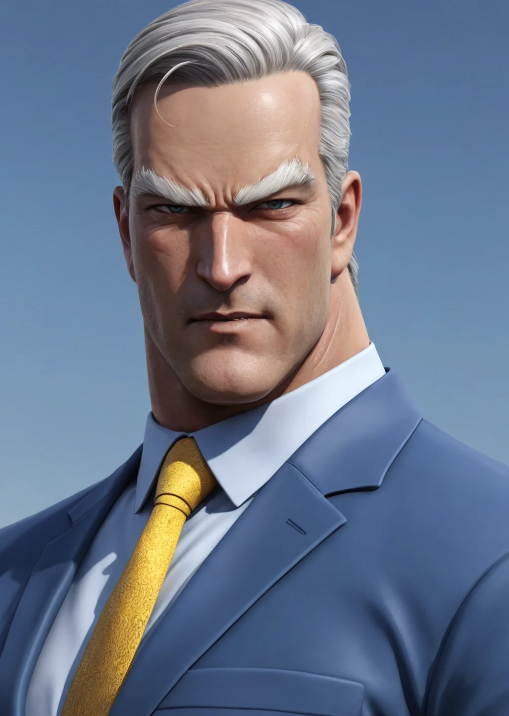 一定要配合我的tag:(the evil within:1.2),(muscle line:1.1),(evil smile:1.2),grin,dye the hair,(white hair:1.1),slicked back hairstyle,(frown:1.2),short hair,blue eyes,staring,(strong:1.1),handsome,(Baby blue suit:1.2),(white shirt:1.1),(yellow necktie:1.1),smug,long sleeves,white eyebrows, (big eyebrows:1.2),mature male,boss,enough hair,robust,blue coat, sturdy,bad man,Fasten clothes,tidy hair