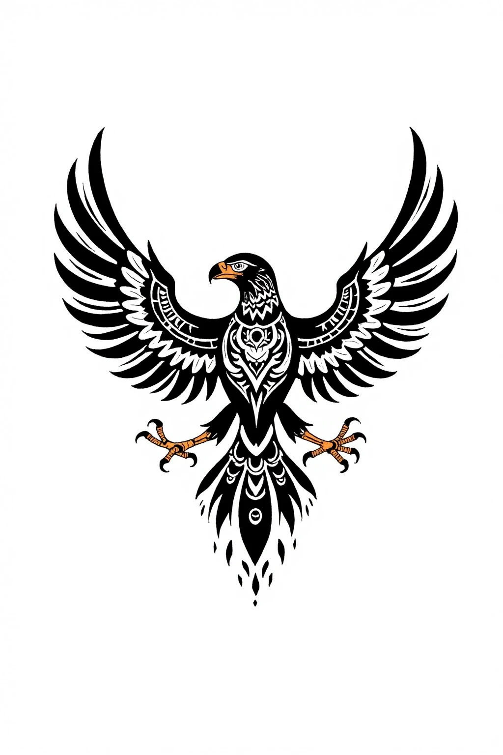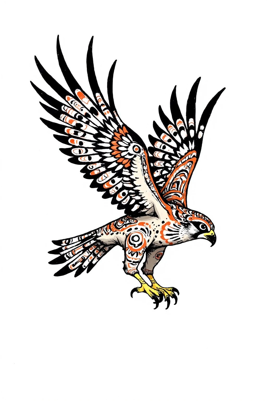 Tribal patterns and dynamic postures, form a tribal - themed falcon, diving, patterns on wings, speed and precision in posture.