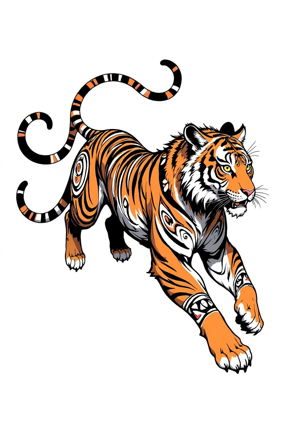 Tribal patterns and dynamic postures, design a tribal - styled tiger, leaping with power, patterns decorating its fur, bold lines, vivid colors, full of wild energy.
