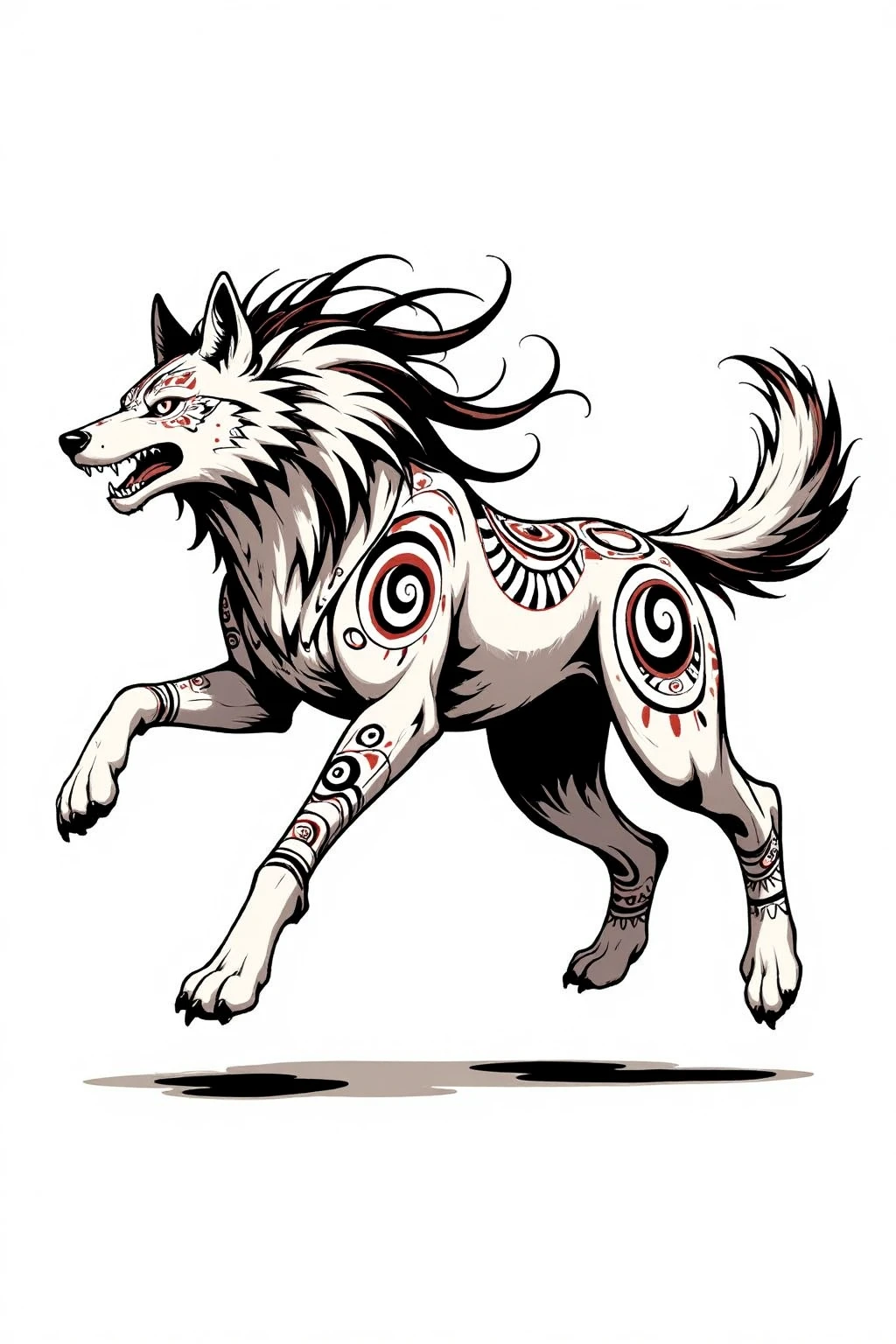 Tribal patterns and dynamic postures, craft a tribal - styled wolf, running, patterns on its body, conveying a sense of the wild pack.