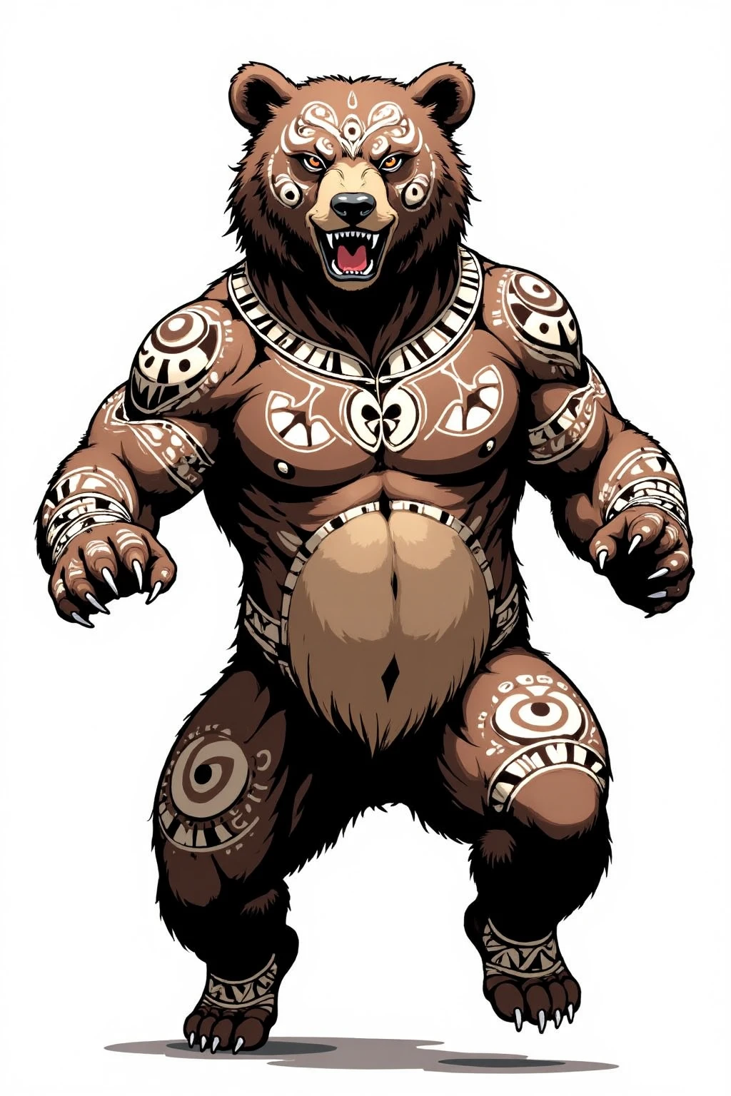 Tribal patterns and dynamic postures, build a tribal - patterned bear, charging, patterns on fur, strong and powerful posture.